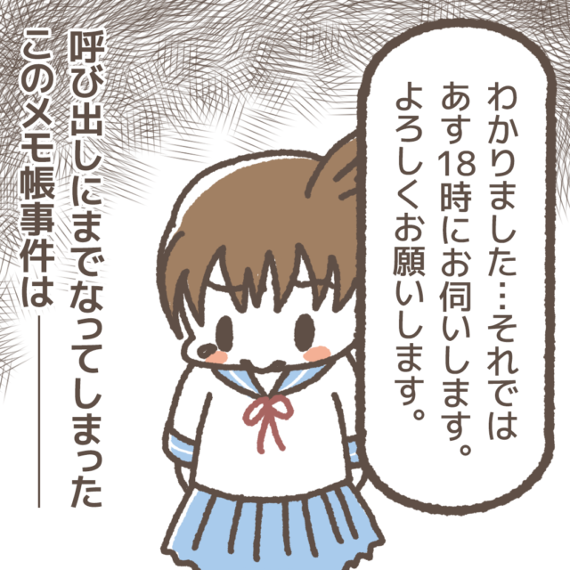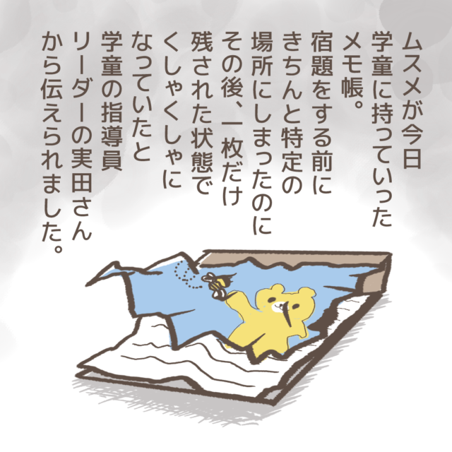 学童の指導員リーダー実田さんから、娘ちゃんのメモ帳がめちゃくちゃになってしまった件で電話がかかってきました。指導員さんの話によると、娘ちゃんはメモ帳を使い終わった後にきちんと自分のロッカーにメモ帳をしまったのですが、別の部屋からロッカーに戻ると、メモ帳は1枚だけが残った状態でシワシワになって床に落ちていたと言うのです・・・。