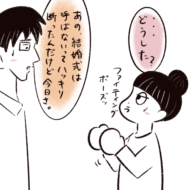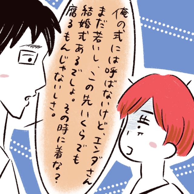 「エンダさんは式に呼ばない」とハッキリ断られたエンダさん、でも全くめげず「異性だからって遠慮せず堂々と呼んでくださいよぉー」とやつれさんに伝えたところ「え?異性の友達は何人か呼ぶよ?」とまたしてもサラリと返されて・・エンダさんのアピールはやつれさんに1ミリも届いていないのでした・・。