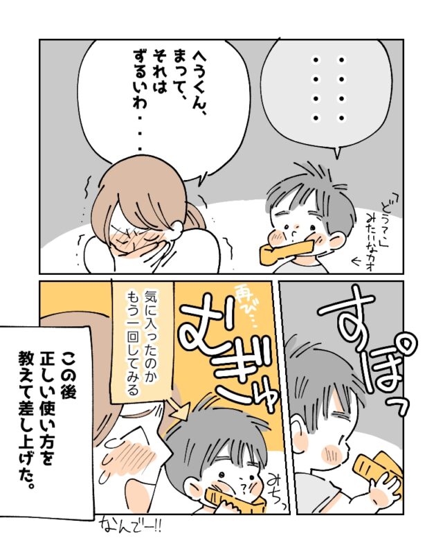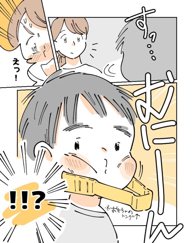4歳の女の子くうちゃんと1歳の男の子へうくんのママであるマキノさんから、へうくんとトングのお話です。