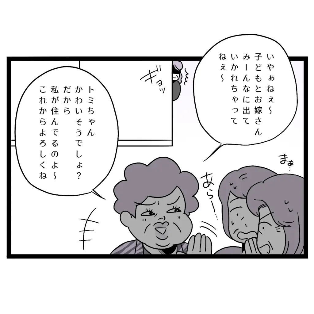 義姉の勢いはそれだけにとどまりません。ご近所さんにまで、息子と嫁に出て行かれたことを包み隠さず言いふらしたのです。「子どもとお嫁さんみーんなに出て行かれちゃって、かわいそうだから私が住んであげてるの」義姉は、まるで自分が義母を助けているかのように話し、近所での義母の評判はガタ落ち。