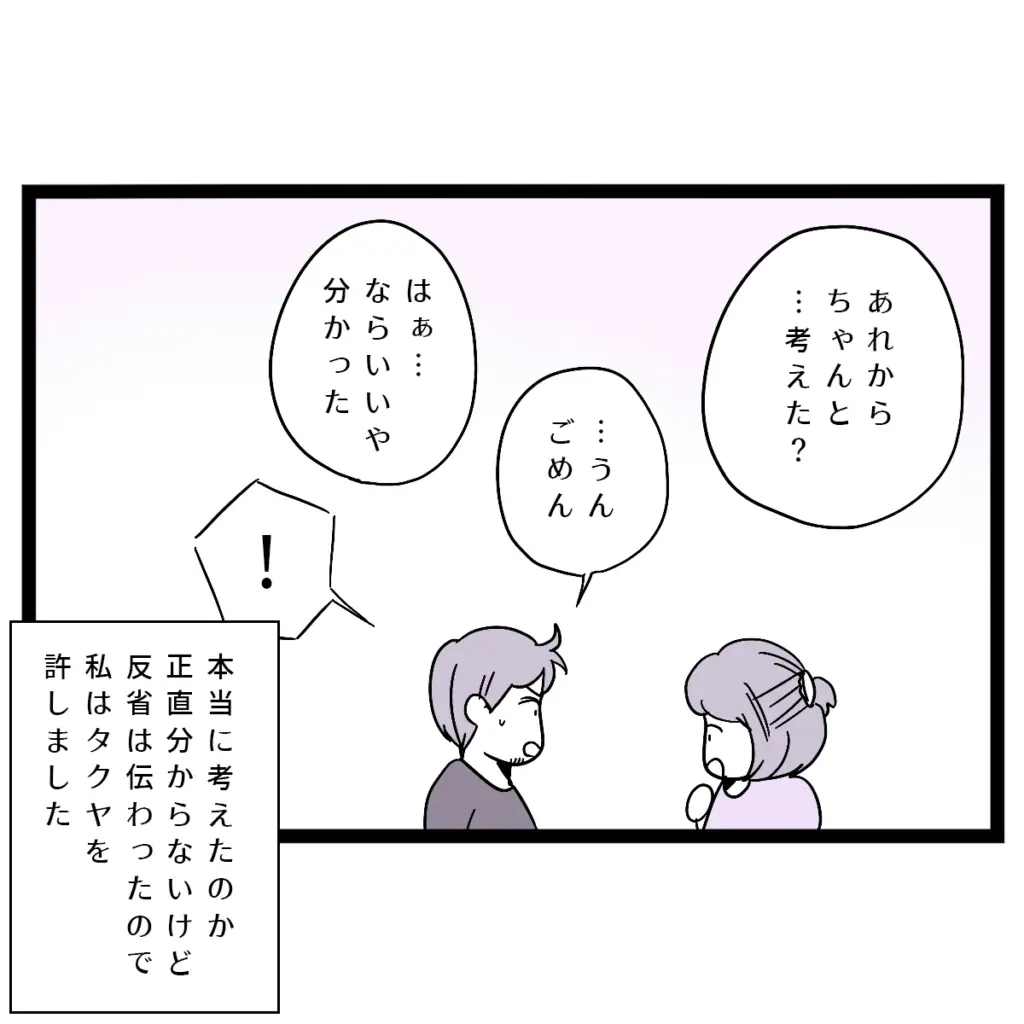 「あれからちゃんと考えた?」私がそう尋ねると、タクヤは反省した表情で「うん、ごめん」と答えました。本当に考えたのかは正直わかりませんが、反省の気持ちは伝わったので、私はタクヤを許すことにしました。ただ、同じことが繰り返されないように、あの家には帰らないこと、義母とは距離を置くこと、この2つを約束しました。