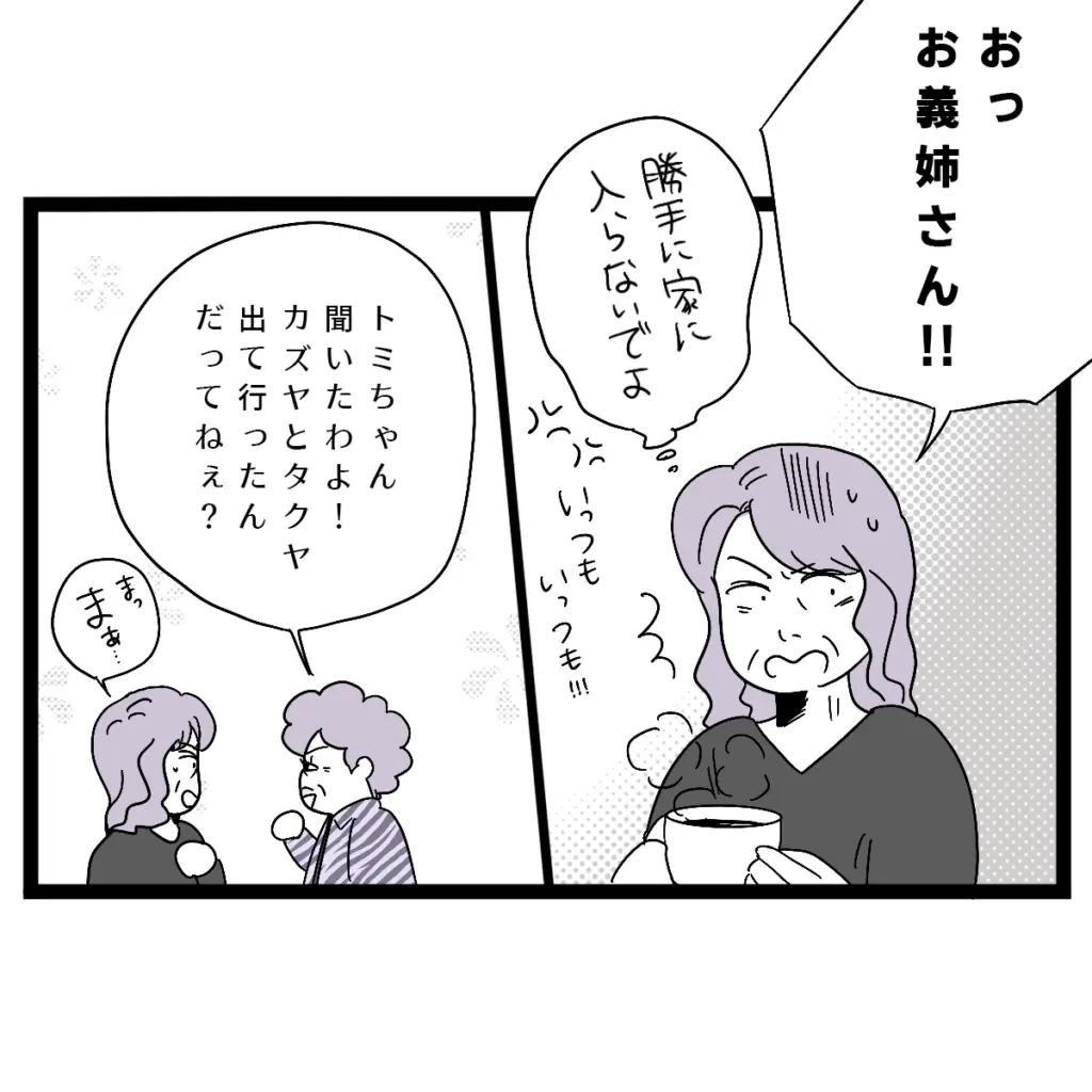 アポなしで突然やって来たうえに、勝手に家に入るデリカシー皆無の義姉に驚く義母。すると、義姉はニヤニヤしながら、「聞いたわよ~!カズヤとタクヤ、出て行ったんだってねぇ?」とからかうように言いました。