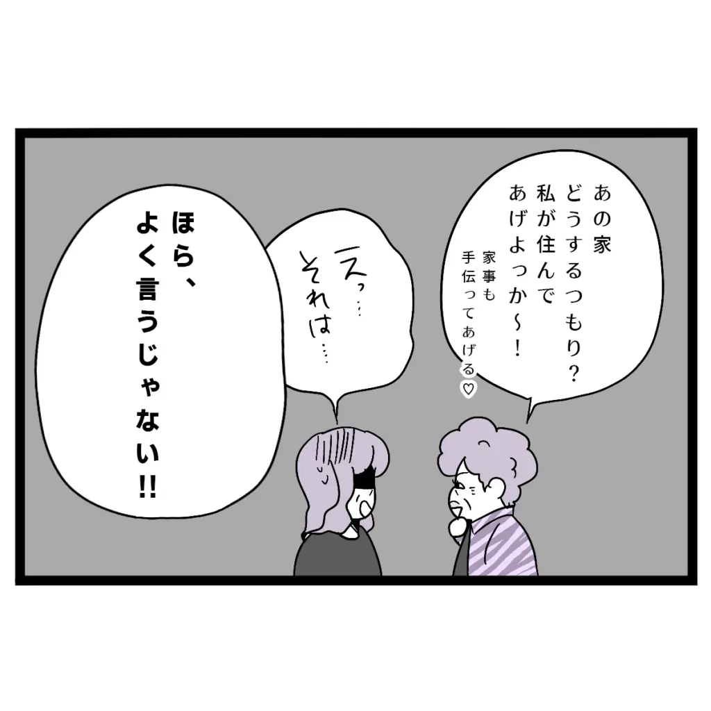 「あの家どうするつもり?私が住んであげよっか」まさかの提案に、義母の顔はみるみる青ざめます。なんとか阻止しなければと思い「えっ、それは・・・」と口を開きかけた瞬間、義姉はそれを遮るように「ほら、よく言うじゃない!」と大きな声で言いました。