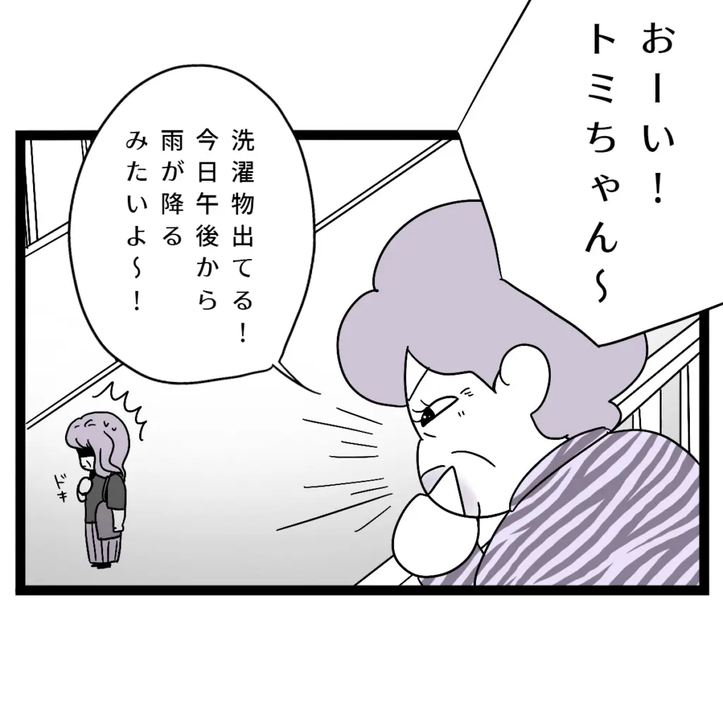 義姉に強く押され、泣く泣く敷地内同居を承諾してしまった義母。・・・しかし、本当に大変なのはここからでした。「おーい洗濯物出てる!今日午後から雨が降るみたいよ~!」ベランダから義母に大声で呼ばれ、ドキッする義母。どうやら前までは自分が『監視する側』だったのが、義姉の登場により『監視される側』になったようです。