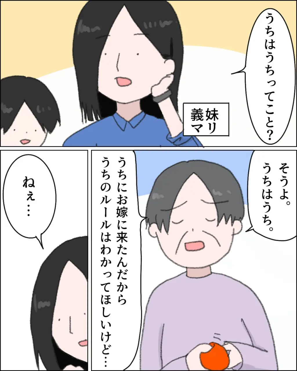 2人の不満を黙って聞いていたマリちゃんが、「つまり、うちはうちってこと?」と尋ねました。義母は少し困ったように、「そうよ、うちにお嫁に来たんだからルールはわかってほしいけど」と答えます。するとマリちゃんは何か思うことがあるのか、少し考えると「ねぇ・・・」と口を開きました。