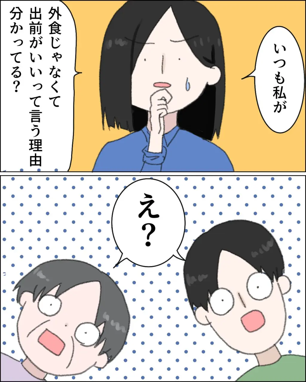 マリちゃんは険しい表情で、「いつも私が、外食じゃなくて出前がいいって言う理由わかってる?」と問いかけます。その言葉に、義母とヒロユキは思わず「え?」と驚いた表情を浮かべました。