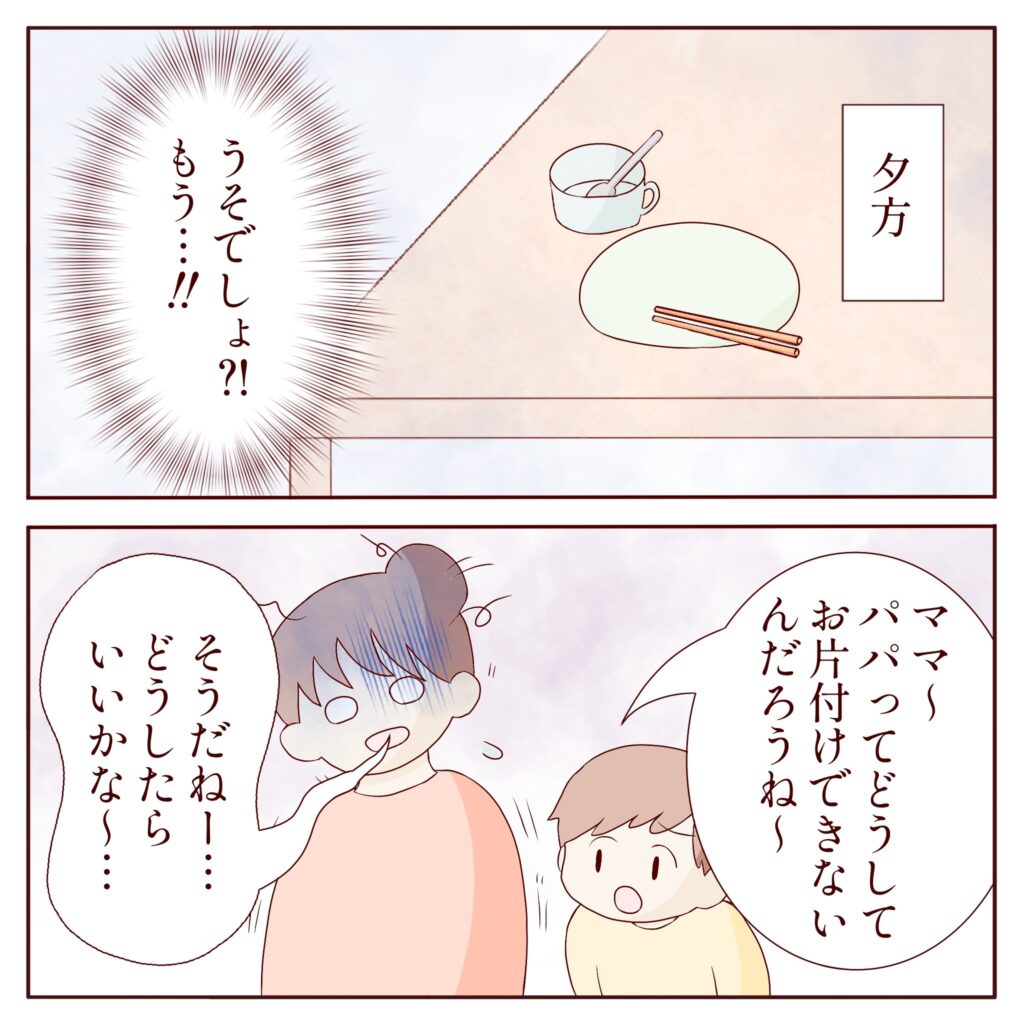 「うそでしょ!?もう・・!!」と心の中で怒りに震えていると、「ママ~、パパってどうしてお片づけできないんだろうね~」と呆れるコノハくん。「そうだねー・・どうしたらいいかな~・・」と呆然としてしまいました。