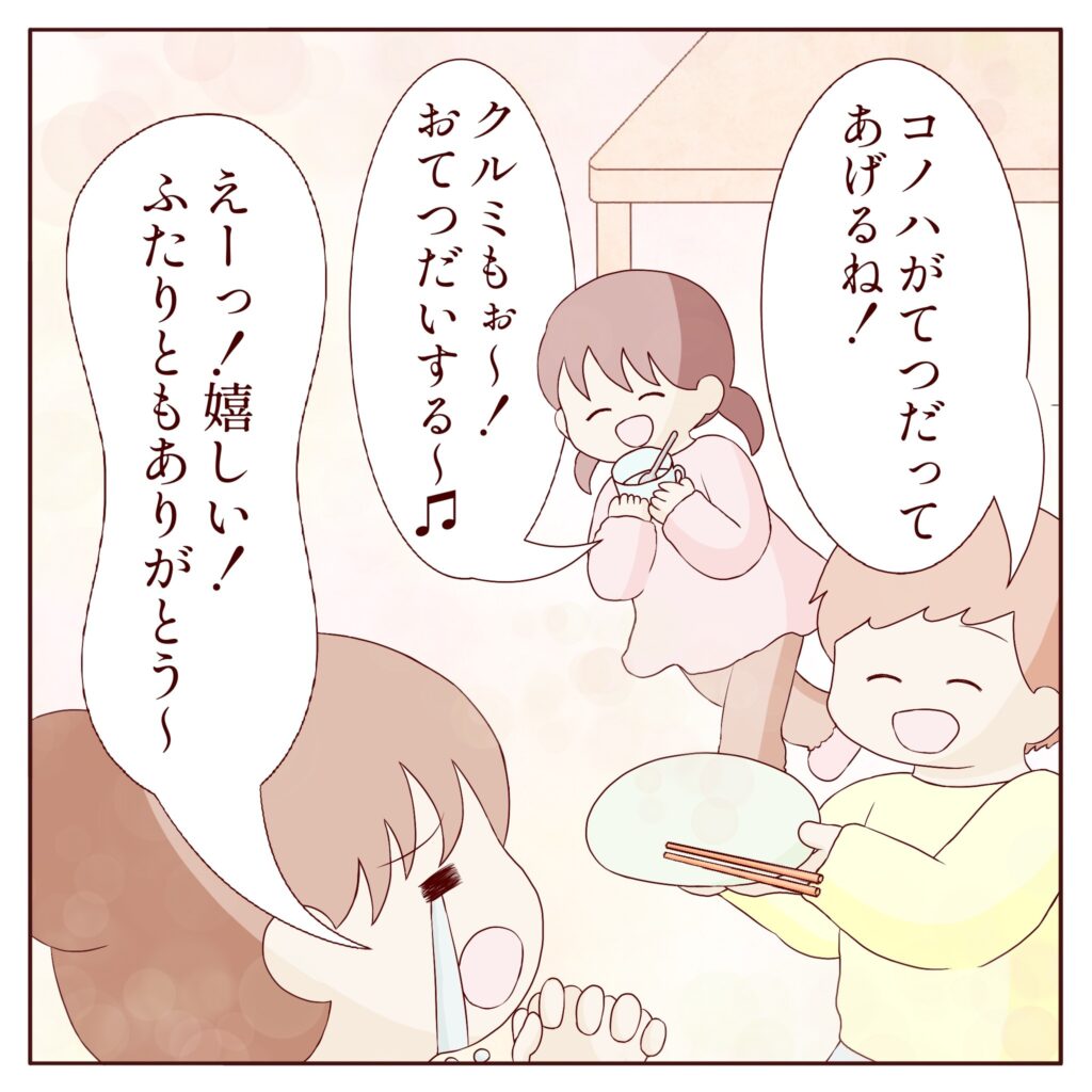 すると、「コノハが手伝ってあげるね!」「クルミもぉ~!おてつだいする~」と子どもたちの言葉に、「えーっ!嬉しい!ふたりともありがとう」と嬉しくて涙が出てきました。