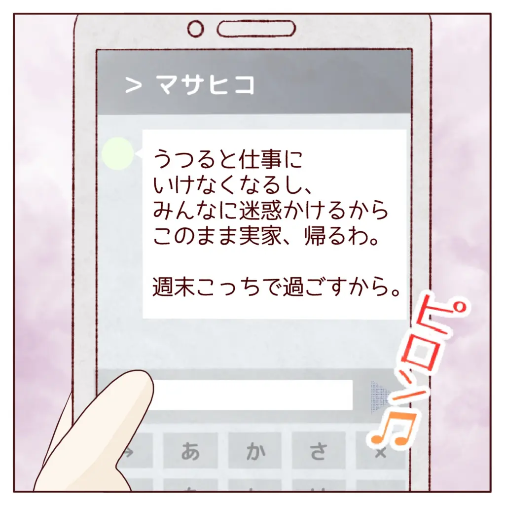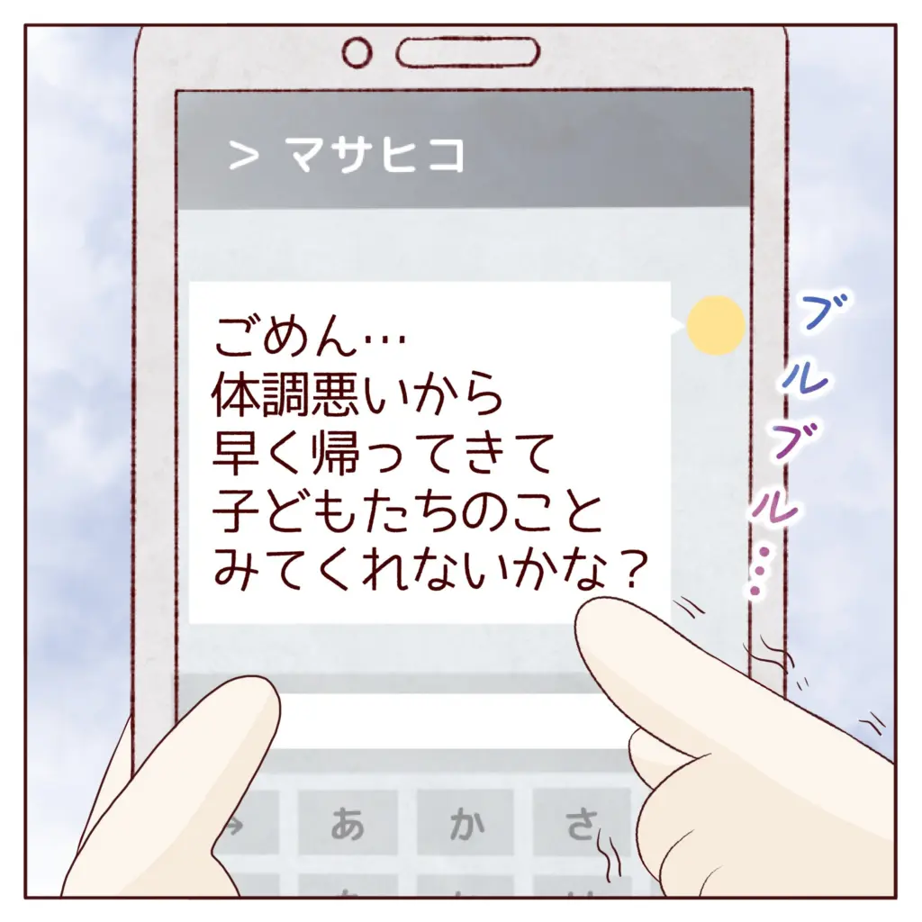 「ごめん・・体調悪いから、早く帰ってきて子どもたちのことみてくれないかな?」寒さで震えながらマサヒコにメッセージを送り、子どもたちをみてくれるよう頼みました。