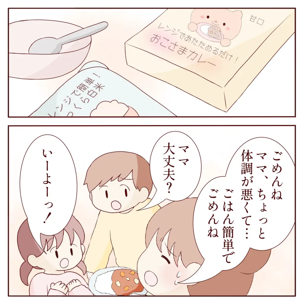 起き上がるのも辛かったけれど、そうも言っていられず買い置きしてあったレトルト食品でなんとか子ども達に夕食を準備。「ごめんね。ママ、ちょっと体調が悪くて・・。ごはん簡単でごめんね」とカレーライスを出すと、子ども達は「ママ大丈夫?」「いーよーっ!」と私を気遣い文句も言わずに食べてくれました。
