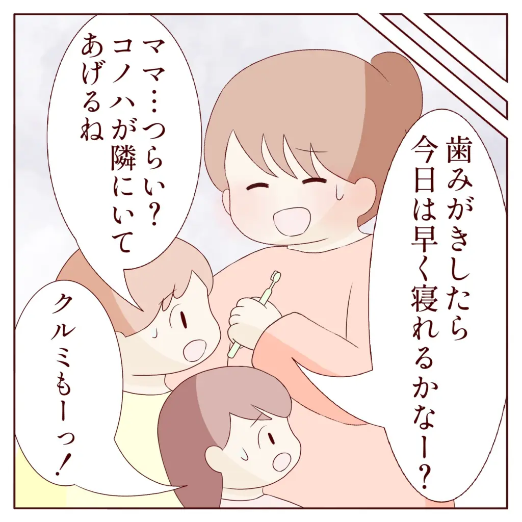 子ども達に夕食を食べさせ、気合でお風呂も入れました。あとは歯磨きだけ。頑張れ私・・!「歯みがきしたら今日は早く寝れるかなー?」と笑顔を作ると、私が辛そうなことに気づいたコノハとクルミが「ママ・・つらい?コノハが隣にいてあげるね」「クルミもーっ!」と心配そうに言いました。