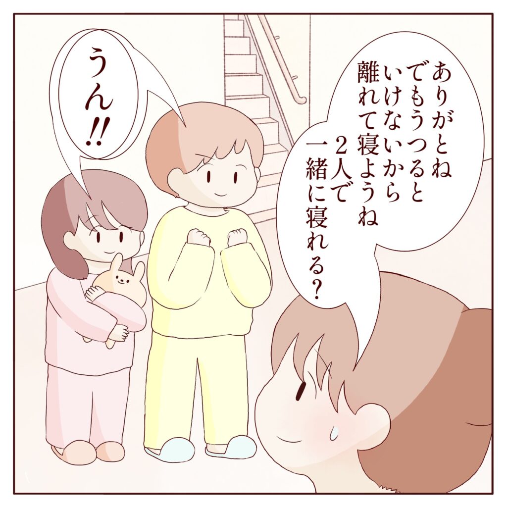 子ども達の優しさを嬉しく思いながら、「ありがとね。でもうつるといけないから離れて寝ようね。2人で一緒に寝れる?」と聞くと、二人はぐずることなく「「うん!!」」と力強い返事をしてくれました。