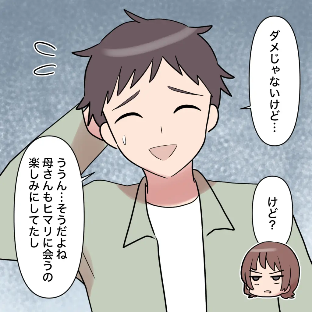 昨日ふと湧き上がった義母への違和感を確かめたくて、私はトモヤに「今度ヒマリを連れてお義母さんとキョウカさんに会いに行きたい」と頼みました。するとトモヤは「え・・」と声を漏らし、驚いたような表情を浮かべます。その反応が気になった私は「ダメ?」と聞き返しました。
