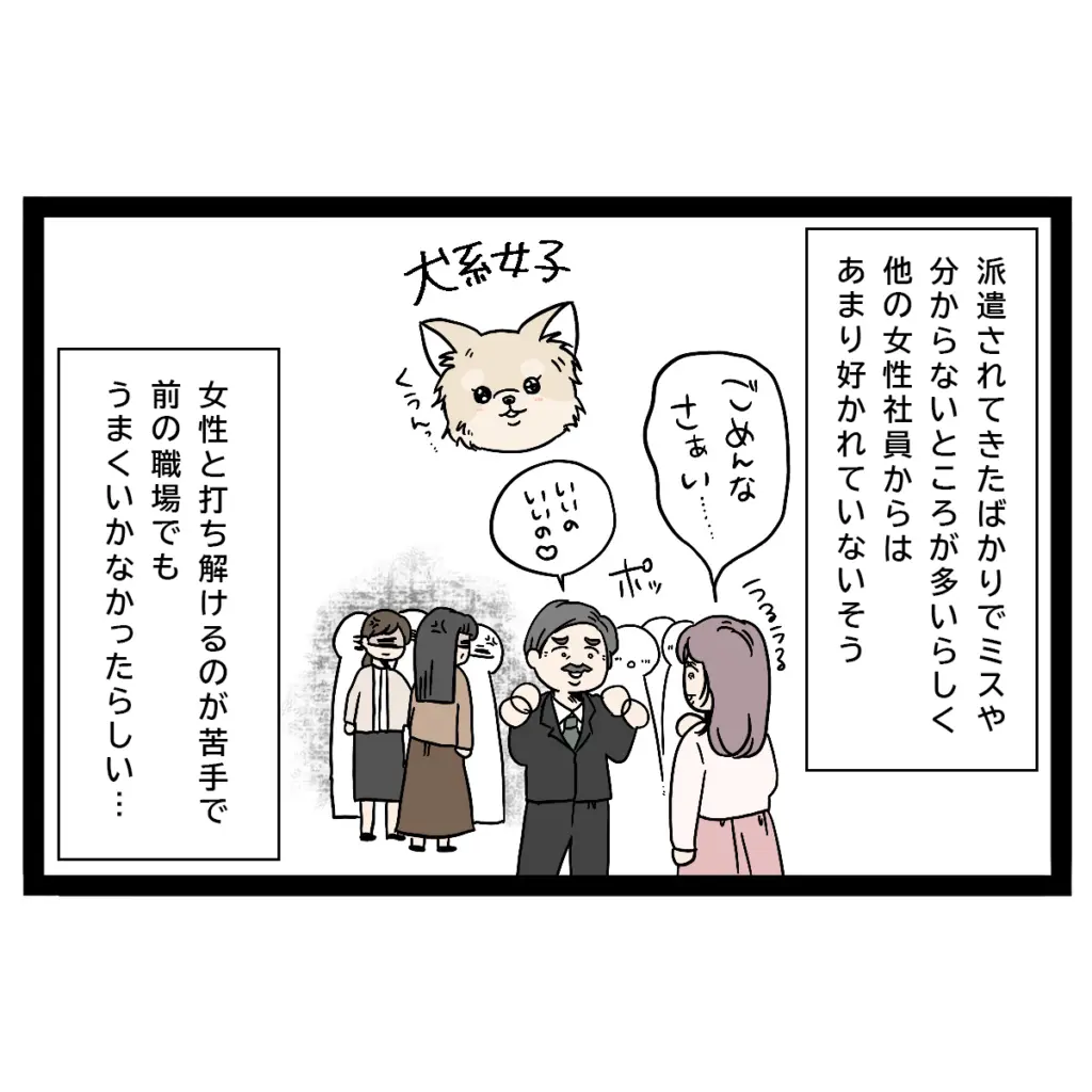 派遣されたばかりでミスが多く、他の女性社員からあまり好かれていないそう。本人は「女性と打ち解けるのが苦手」と言っているようですが、実際は男性社員にだけ愛想を振りまくから、それが理由で女性社員からあまり好かれないのでしょう。いわゆる「あざと女子」というやつです。