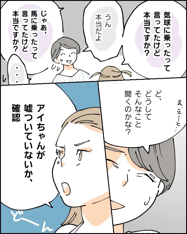 「気球に乗ったって言ってたけど本当ですか?」とまた質問され、「うん本当だよ」と認めると、「じゃあ、馬に乗ったって言ってたけど本当ですか?」と次から次へと事実確認された私は「え、えーと・・ど、どうしてそんなこと聞くのかな?」とヨウちゃんにたずねると、「アイちゃんが嘘ついていないか確認」と平然と答えるヨウちゃん。