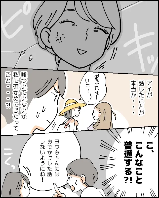 こ、こんなこと普通する!?そう思いながら、「ヨウちゃんにはおでかけした話しないようにね!」とアイに言い、アイはこくっと頷きました。