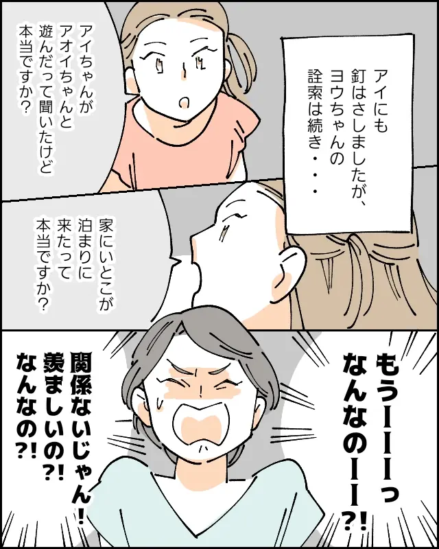 「アイちゃんがアオイちゃんと遊んだって聞いたけど本当ですか?」「家にいとこが泊まりに来たって本当ですか?」とヨウちゃんは全てにおいて事実かを確認しないと気がすまないようで、「もうーーーっなんなのーー!?関係ないじゃん!羨ましいの!?なんなの!?」と私は訳がわからなくなりました。