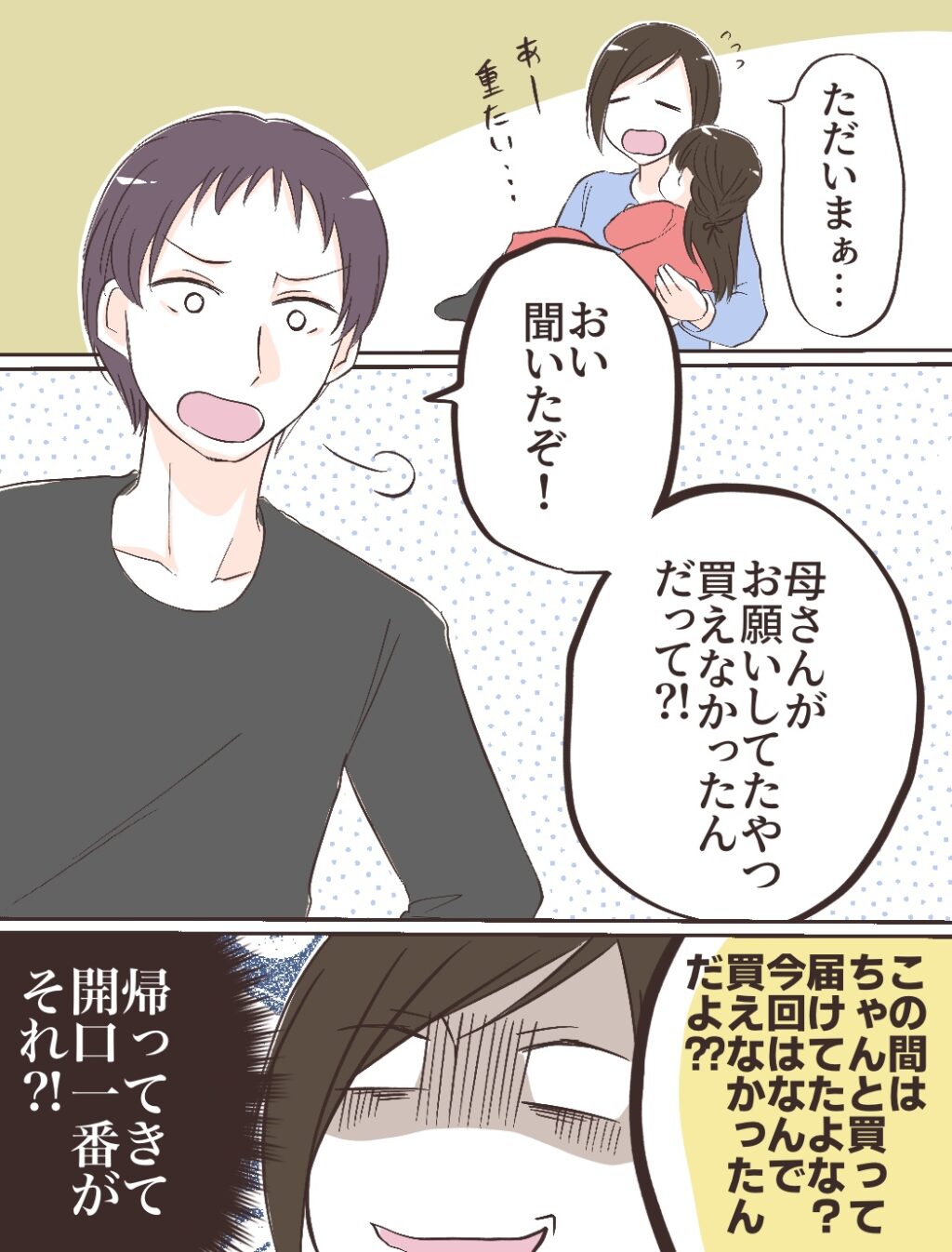 疲れて眠ってしまったリナを抱きかかえながら、やっとの思いで家に帰ってきた私。すると、不満げな表情のタイキがずかずかと玄関にやってきて「聞いたぞ!母さんがお願いしてたやつ買えなかったんだって?なんで今回は買えなかったんだよ!?」と私を責め立てました。帰ってきて開口一番がそれって・・・。