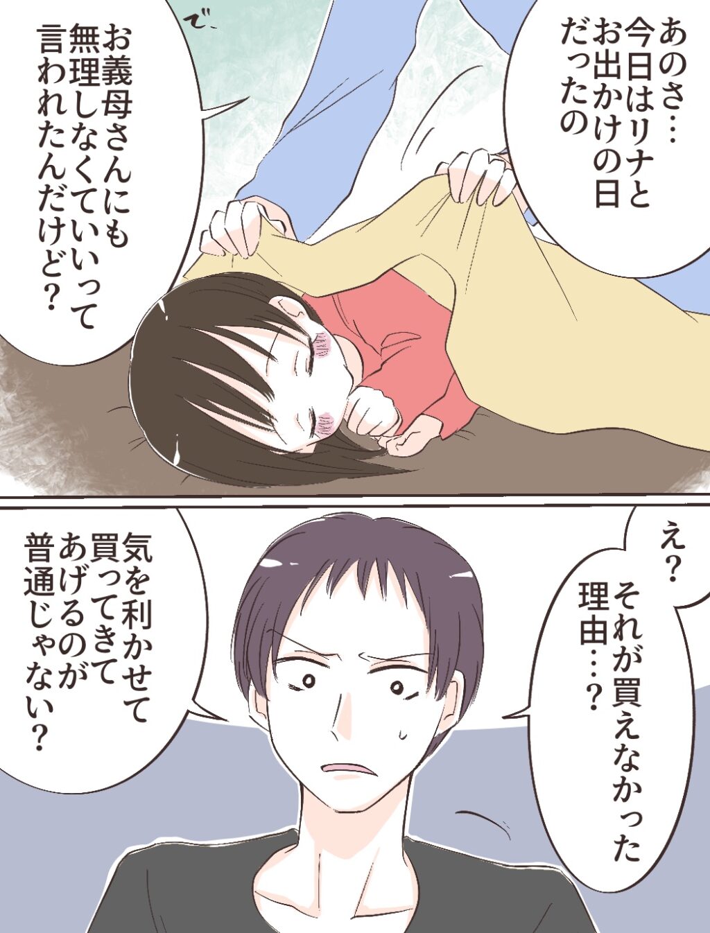 「今日はリナとお出かけの日だったの、お義母さんにも無理しなくていいって言われたんだけど?」私はリナをベッドに寝かせながら、タイキに事情を説明します。ところがタイキは「え?それが買えなかった理由?気を利かせて買ってきてあげるのが普通じゃない?」と私を労わるどころか、責めるように言いました。