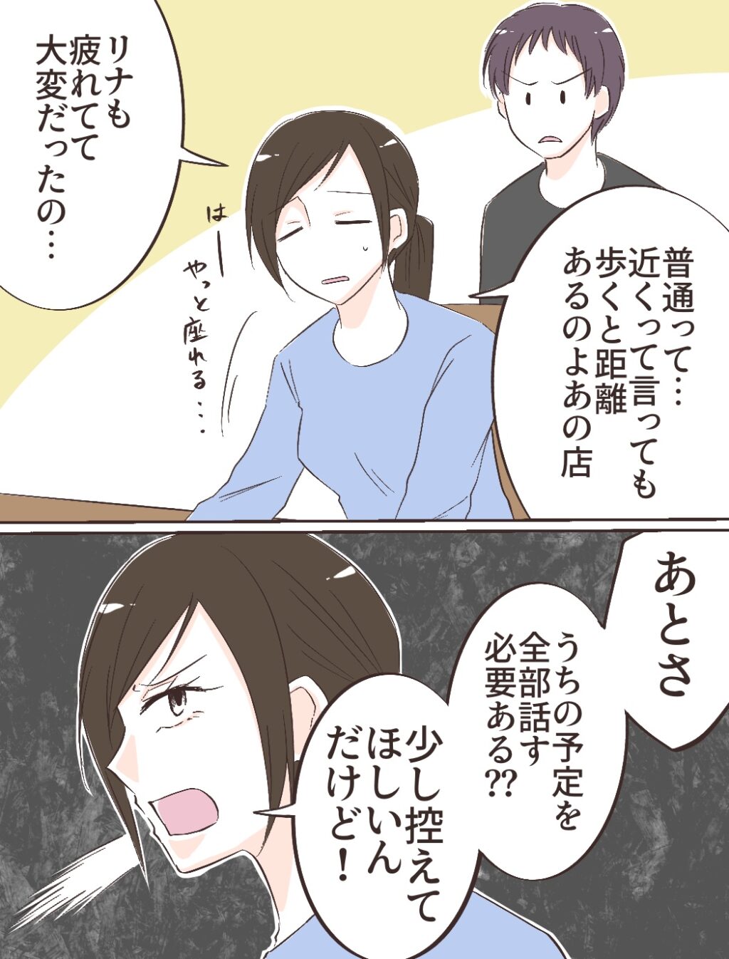「近くって言っても歩くと距離あるのよ、リナも疲れてて大変だったの」お菓子屋さんから家まで、リナを抱えて帰ってきた私の体力は限界寸前。それもこれも、元はと言えば義母にうちの予定を教えたタイキのせいです。私は「うちの予定を全部話す必要ある?少し控えてほしいんだけど」と言ってタイキを睨みました。