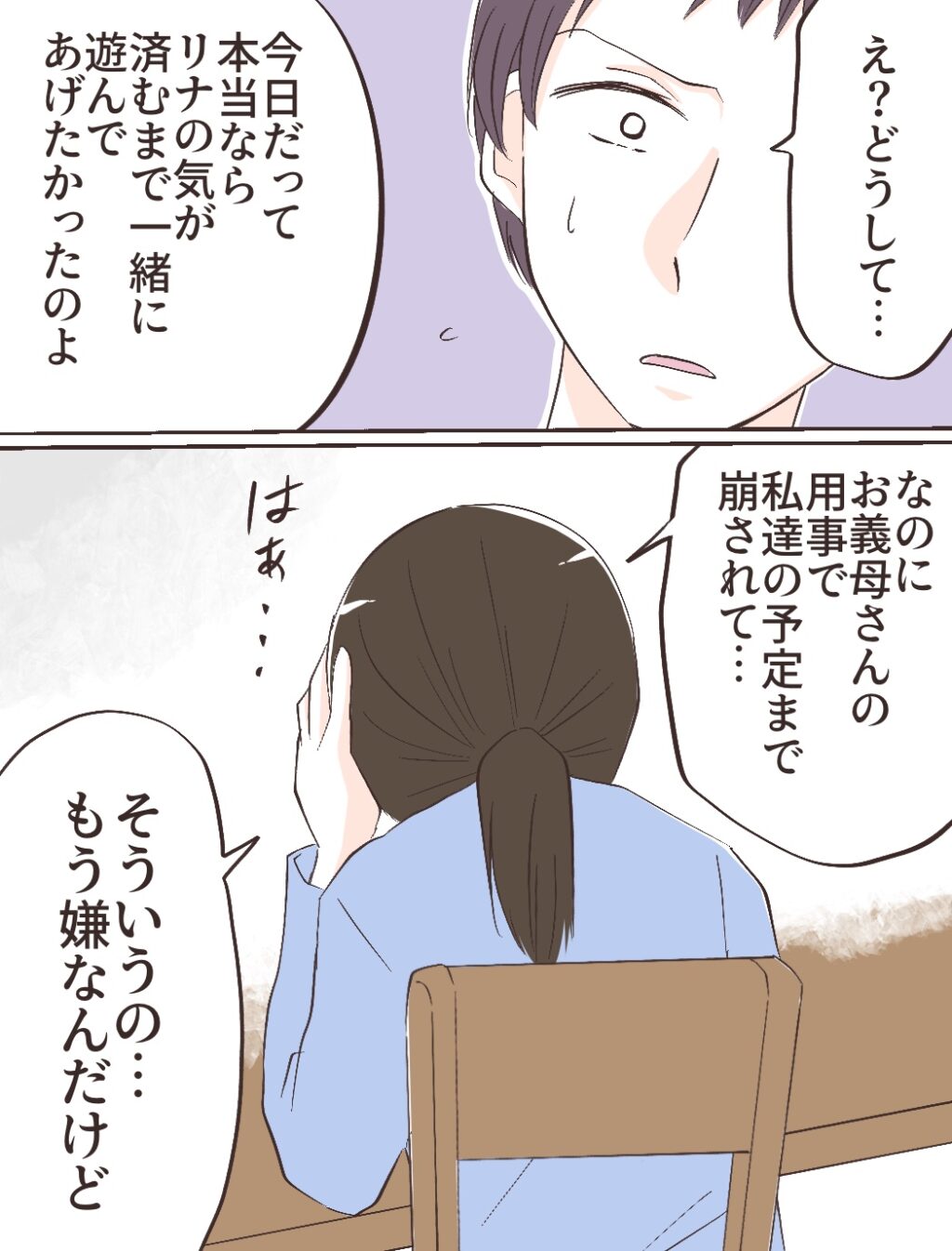「え?どうして・・・」と困惑するタイキに、私はため息をつきながら「今日だって本当ならリナの気が済むまで一緒に遊んであげたかったのよ、なのにお義母さんの用事で私たちの予定まで崩されて・・・もう嫌なんだけど」と伝えます。