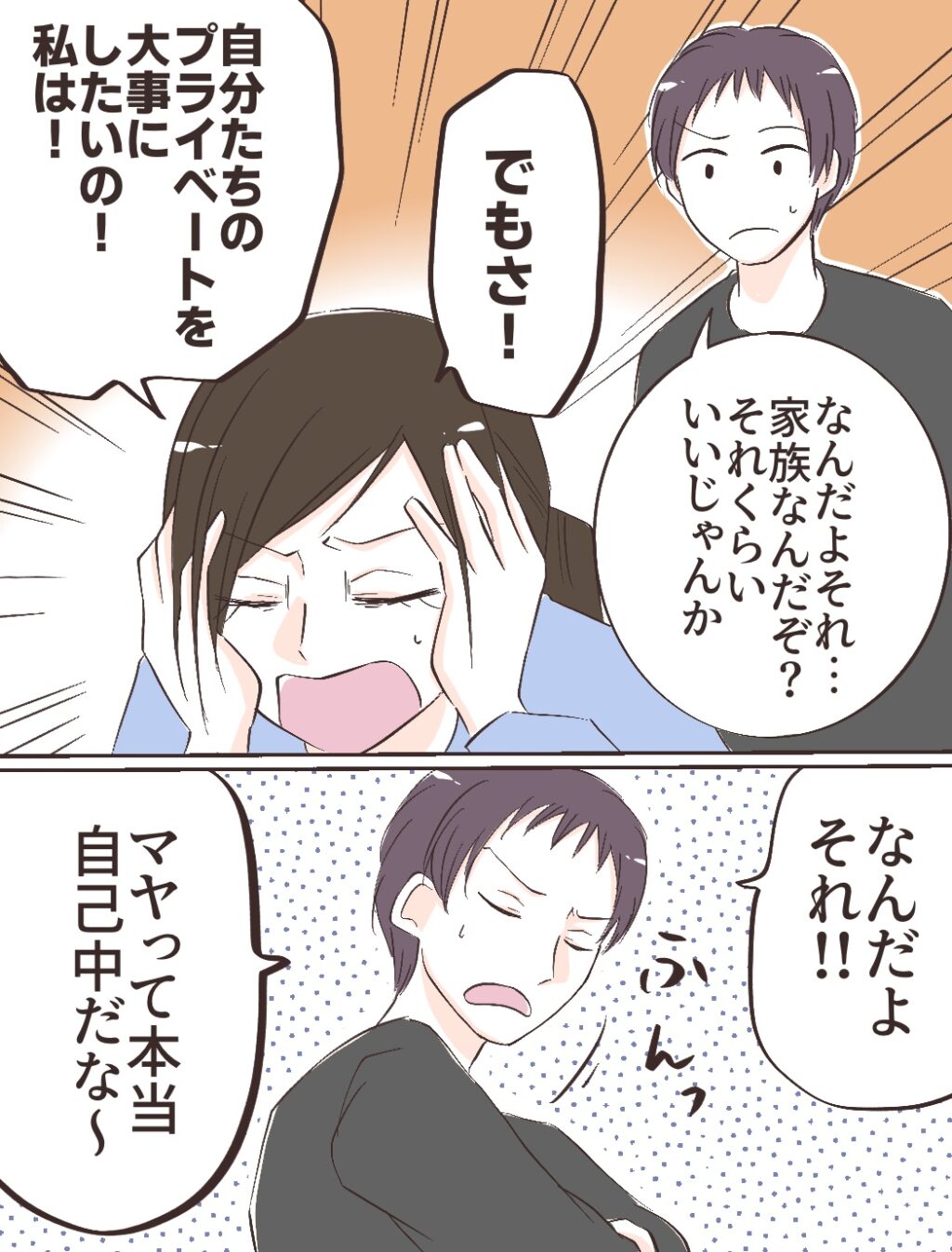 ここまで言ってもわからないのか「なんだよそれ・・・家族なんだぞ?それくらいいいじゃんか」と呆気にとられるタイキ。私は「家族でも自分たちのプライベートは大切にしたい」と伝えましたが、「マヤって本当自己中だな~」の一言で片付けられてしまいました。