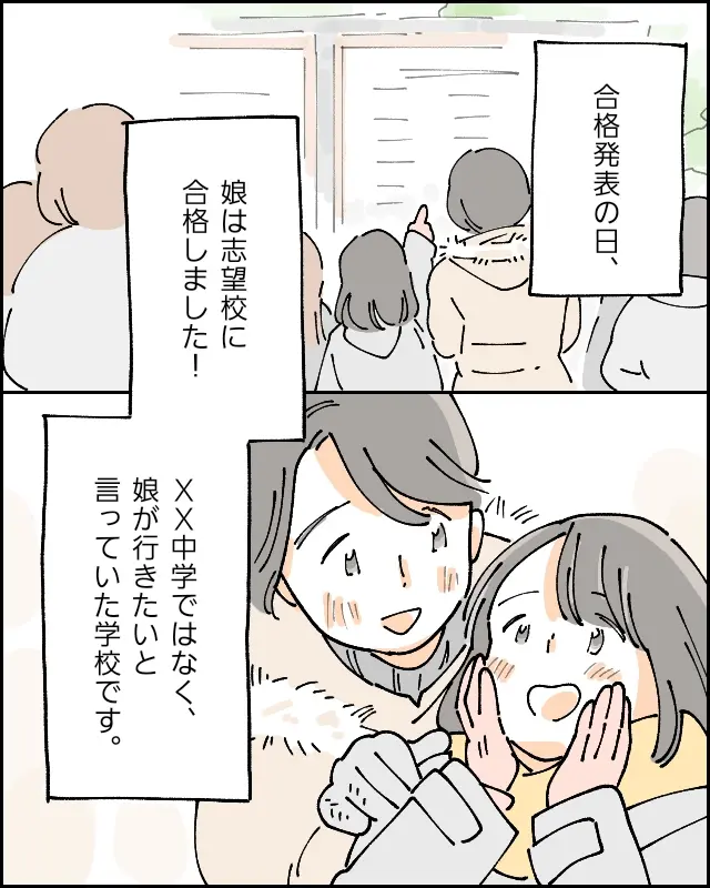 時は過ぎ、合格発表の日。努力の甲斐あってアイは志望校に無事合格しました。学区のトップ校である××中学ではなく、娘が以前から行きたいと言っていた学校です。