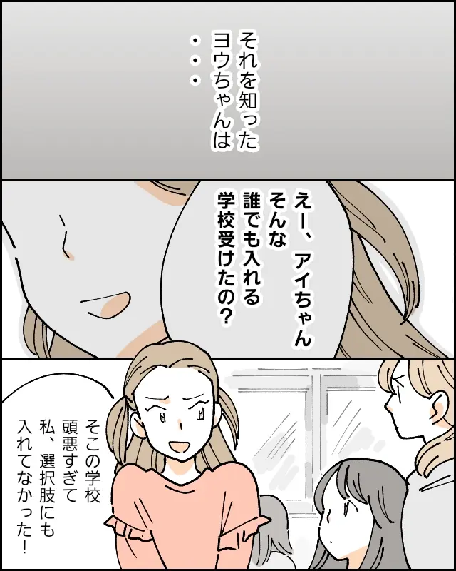 しかし、それを知ったヨウちゃんは「えー、アイちゃんそんな誰でも入れる学校受けたの?そこの学校頭悪すぎて選択肢にも入れてなかった!」と、ここぞとばかりに馬鹿にします。友達を馬鹿にされムッとするアオイちゃんでしたが、アイはマウントに動じることなく、ただヨウちゃんを見つめていました。