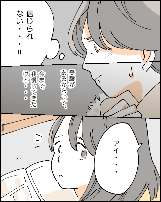 「信じられない・・・!」私は悔しさから、拳をグッと握りしめました。受験があるから今まで何も言わずに我慢してきたけど、もう黙っていられない。アイがヨウちゃんについて直接話してくれることはありませんでしたが、思い切って聞いてみることにしました。