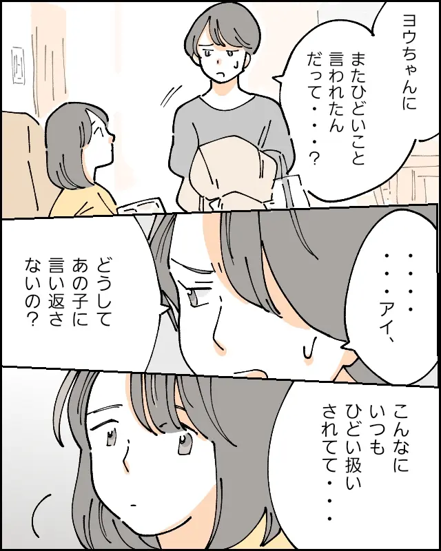 アイちゃんは以前から憧れていた中学校に無事合格したのに、ヨウちゃんはそれを祝うどころか、「頭が悪すぎて選択肢に入れなかった」とわざわざ傷つけるような言葉でバカにします。それでもアイちゃんは何も言い返さず、ただ黙って耐えるばかり。ここまで一方的にひどいことを言われ続けても反論しない姿を見ると、アイちゃんが黙る理由があるのではと考えずにはいられません。
