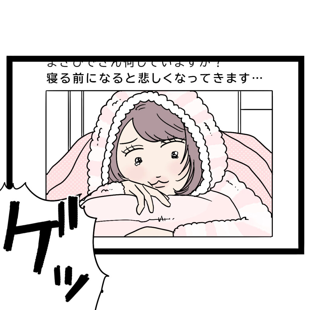 「寝る前になると悲しくなってきます・・」と書かれた投稿が!そこにはフードを被り、ベッドにうつぶせになって涙ぐんでいるレイ子の写真が!!思わず「ゲッ!!」と大きな声を出してしまいました。