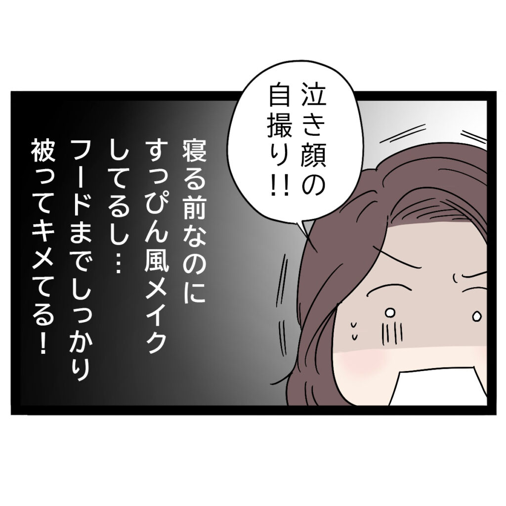 そして、「泣き顔の自撮り!!」と思わず声が出てしまった私は、「寝る前なのにすっぴん風メイクしてるし・・フードまでしっかり被ってキメてる!」とレイ子の計算しつくされた写真を見て呆然。