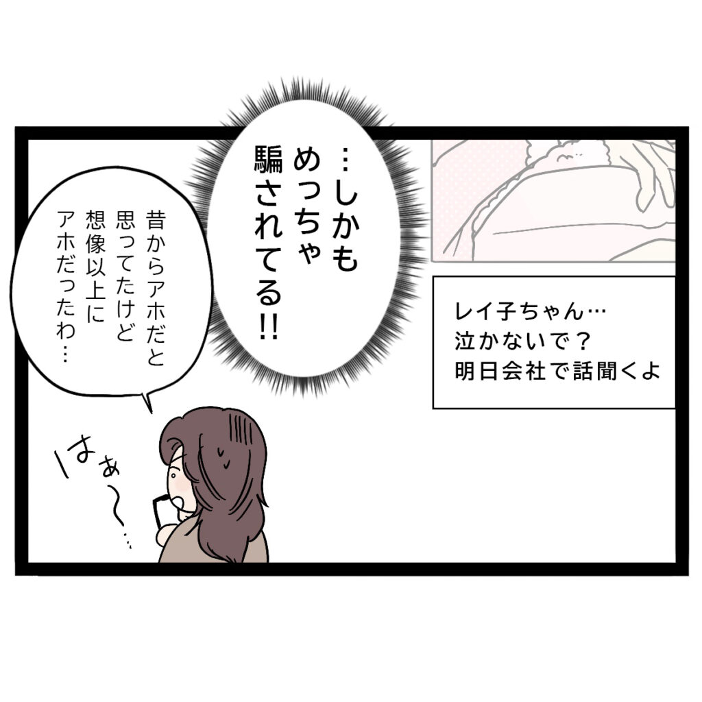 さらに、「レイ子ちゃん・・泣かないで?明日会社で話聞くよ」というまさひでのコメントを見て、「・・めっちゃ騙されてる!!」と驚き、「はぁ~・・昔からアホだと思ってたけど、想像以上にアホだったわ・・」とため息をつきました。