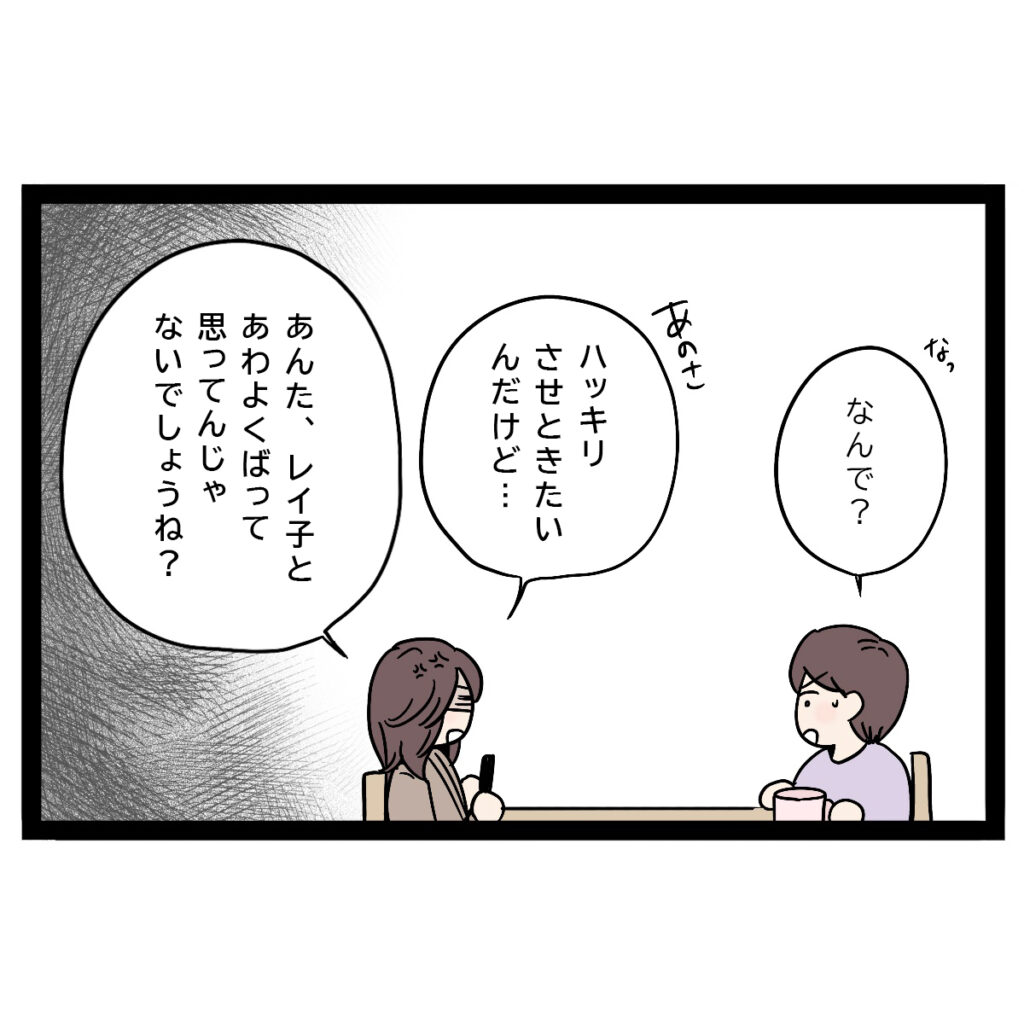 その後、「あのさ、ハッキリさせときたいんだけど・・あんた、レイ子とあわよくばって思ってんじゃないでしょうね?と言うと、「なっ、なんで?」とまさひでが動揺しながら答えました。