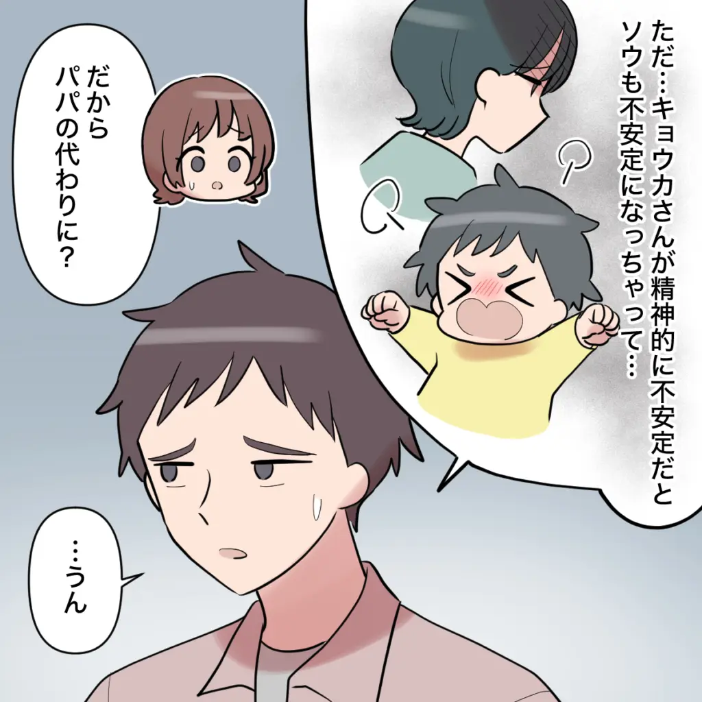 「ただ・・キョウカさんが精神的に不安定だとソウも不安定になっちゃって・・」とトモヤが言い、「だからパパの代わりに?」と聞くと、「・・うん」とトモヤが申し訳なさそうに頷きました。