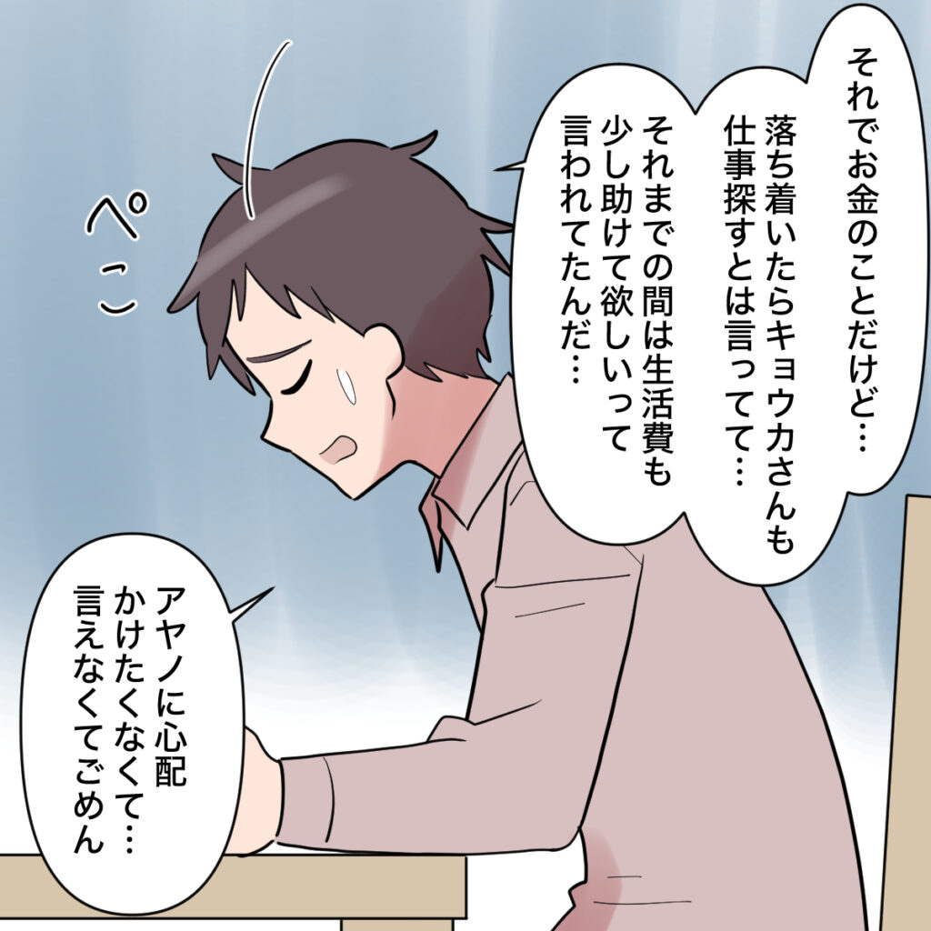 「それでお金のことだけど・・落ち着いたらキョウカさんも仕事探すとは言ってて・・それまでの間は生活費も少し助けて欲しいって言われてたんだ・・。アヤノに心配かけたくなくて・・言えなくてごめん」そう言って頭を下げるトモヤに、