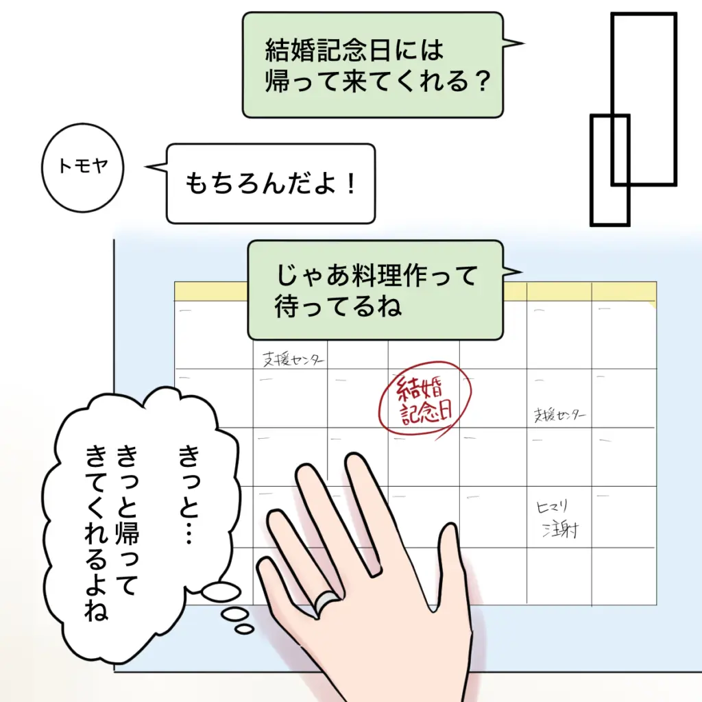 「結婚記念日には帰って来てくれる?」さすがに結婚記念日は帰って来るだろうとメッセージを送ると「もちろんだよ!」と返信が。「じゃあ料理作って待ってるね」と返信し、「きっと・・きっと帰ってきてくれるよね」と心の中で祈るような気持ちでした。