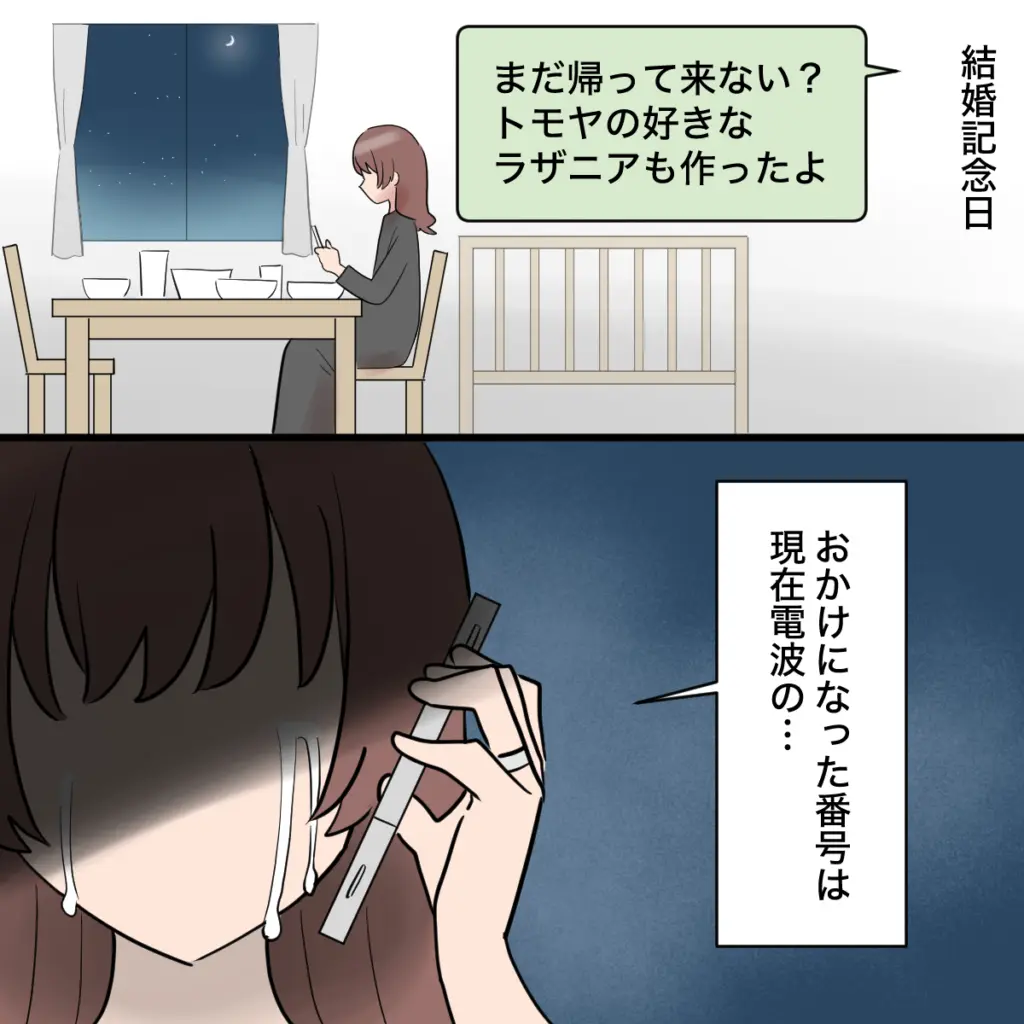 「まだ帰って来ない?トモヤの好きなラザニアも作ったよ」とメッセージを送っても返信はなく、電話してみたのですが、「おかけになった番号は現在電波の・・」とメッセージが流れるだけで、トモヤが電話に出ることはありませんでした。