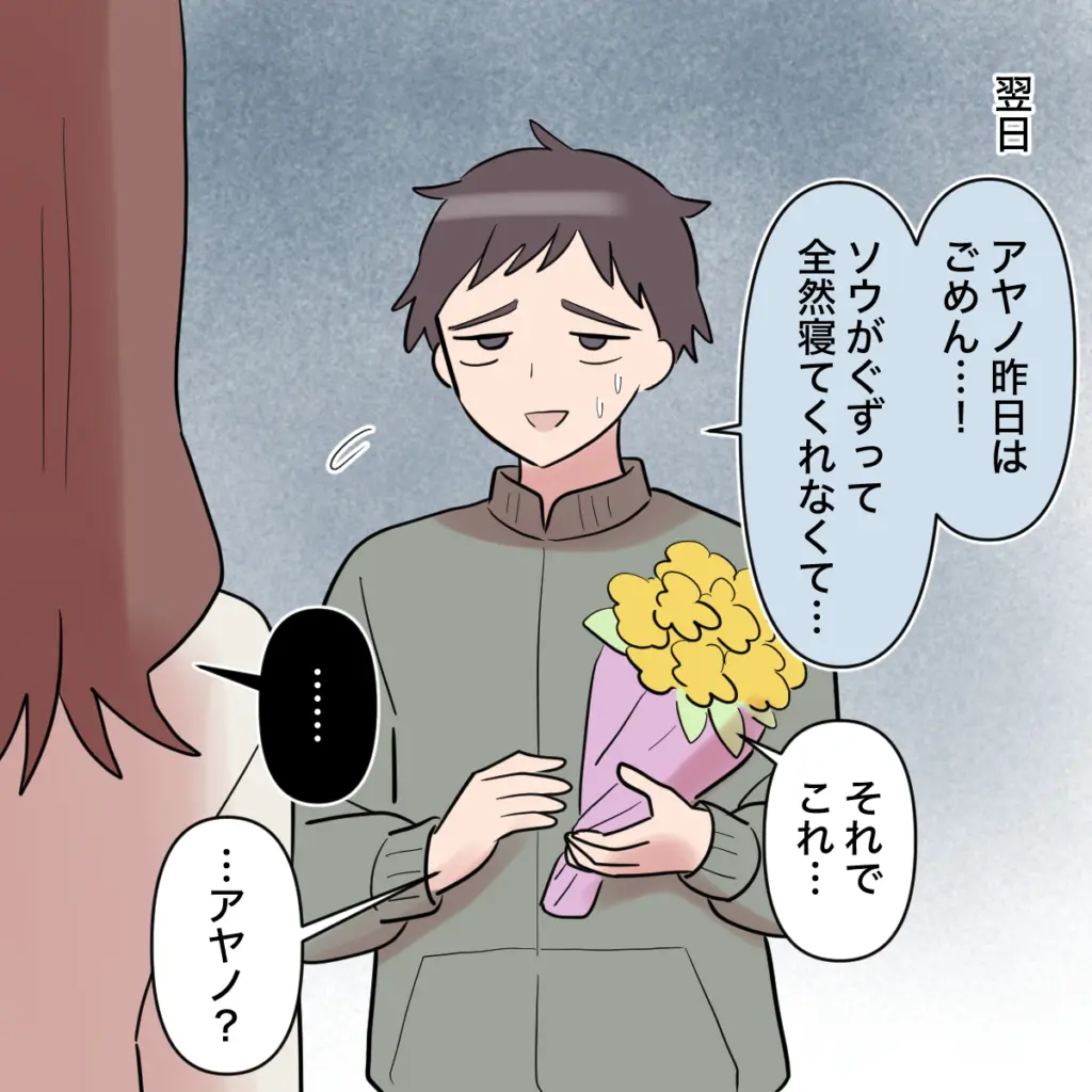 「アヤノ昨日はごめん・・!ソウがぐずって全然寝てくれてなくて・・」そう言いながら手に持っている花束を差し出し、「それでこれ・・」と言われるも何も言う気はおきず無言に。「・・アヤノ?」と申し訳なさそうにトモヤが私を呼んだのでした。