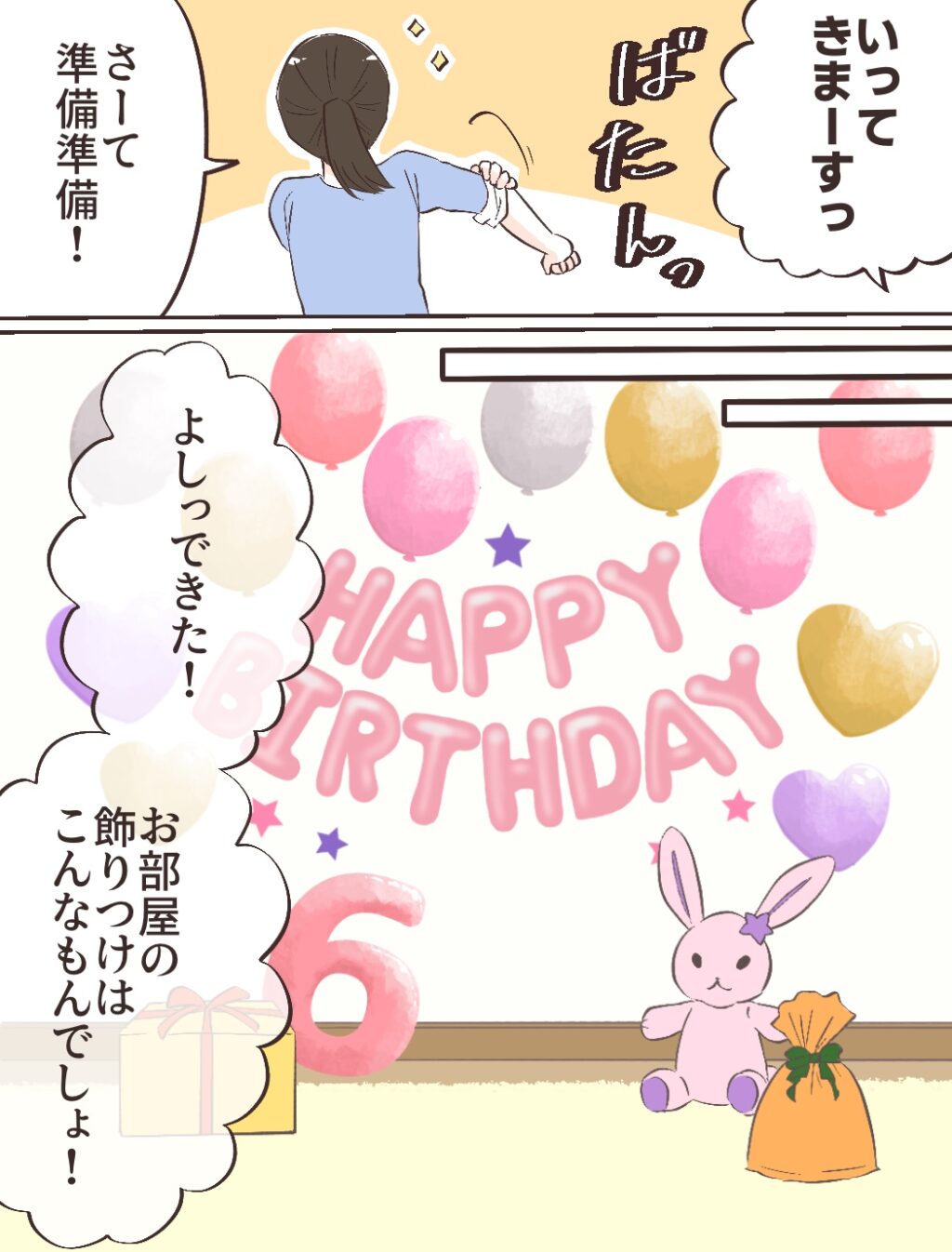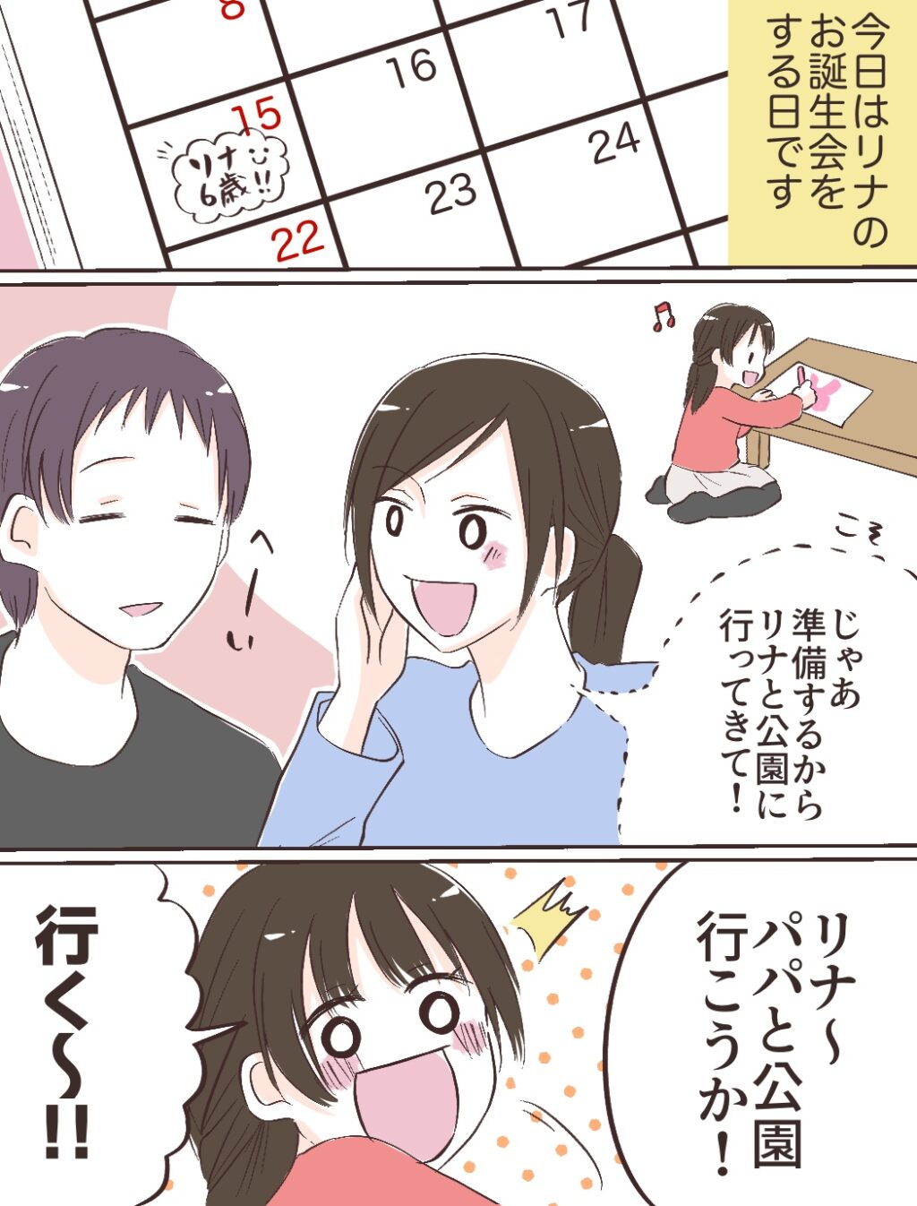 そして、今日はリナの6歳のお誕生日。私はリナに内緒でお誕生日会の準備をするために、タイキにリナを公園へ連れ出してもらうように頼みました。「リナ~パパと公園行こうか!」タイキがそう声をかけると、リナはガバッと顔を上げ「行く~!」と嬉しそうに言います。