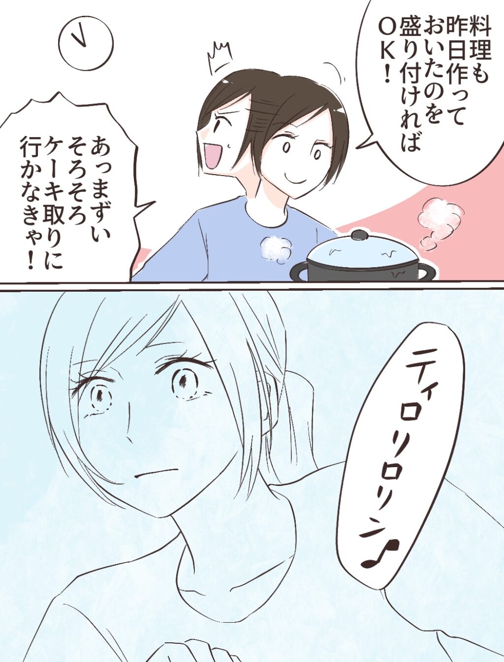 料理は、昨日のうちに作っておいたものを温めて盛り付けるだけ。あとは予約してあるケーキを指定の時間に取りに行けば完璧です。そう思って時計を見ると、受け取り時間が目前に迫っていることに気付きます。「まずい、そろそろケーキ取りにいかなきゃ!」と焦って走り出した瞬間、急にスマホの着信音が鳴りました。