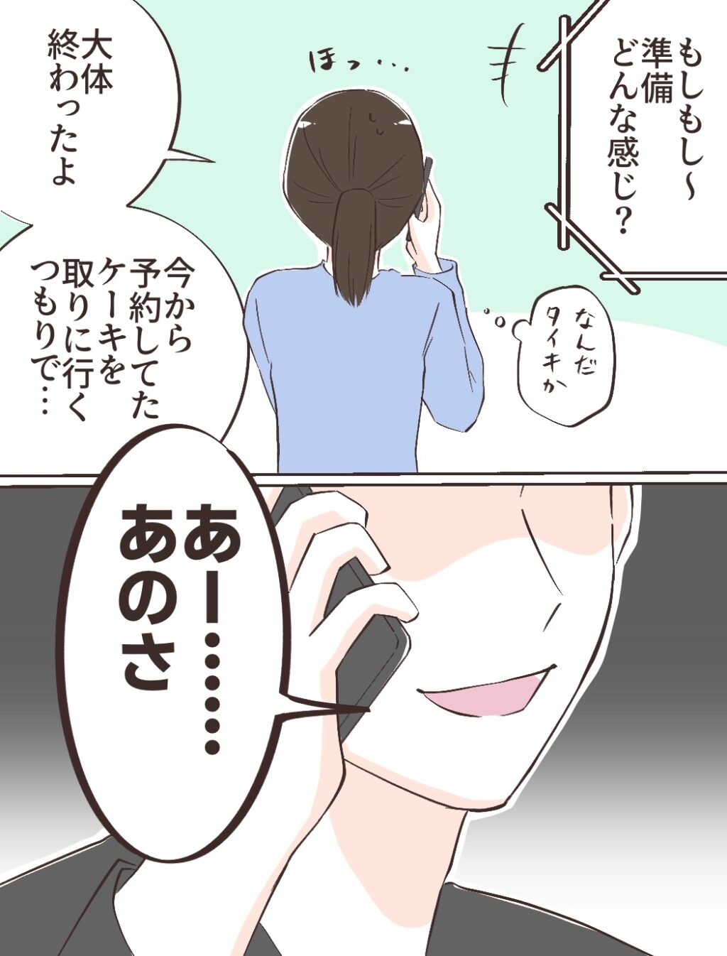 一瞬、義母がよぎりましたが、スマホには「タイキ」の文字が。なんだタイキか・・・ほっとしながら電話に出ると、「もしもし~準備どんな感じ?」と進捗を尋ねられました。「大体終わったよ、今から予約してたケーキを取りに行くつもりで・・・」私がそう言うと、タイキは私の声を遮るように「あのさ」と切り出しました。