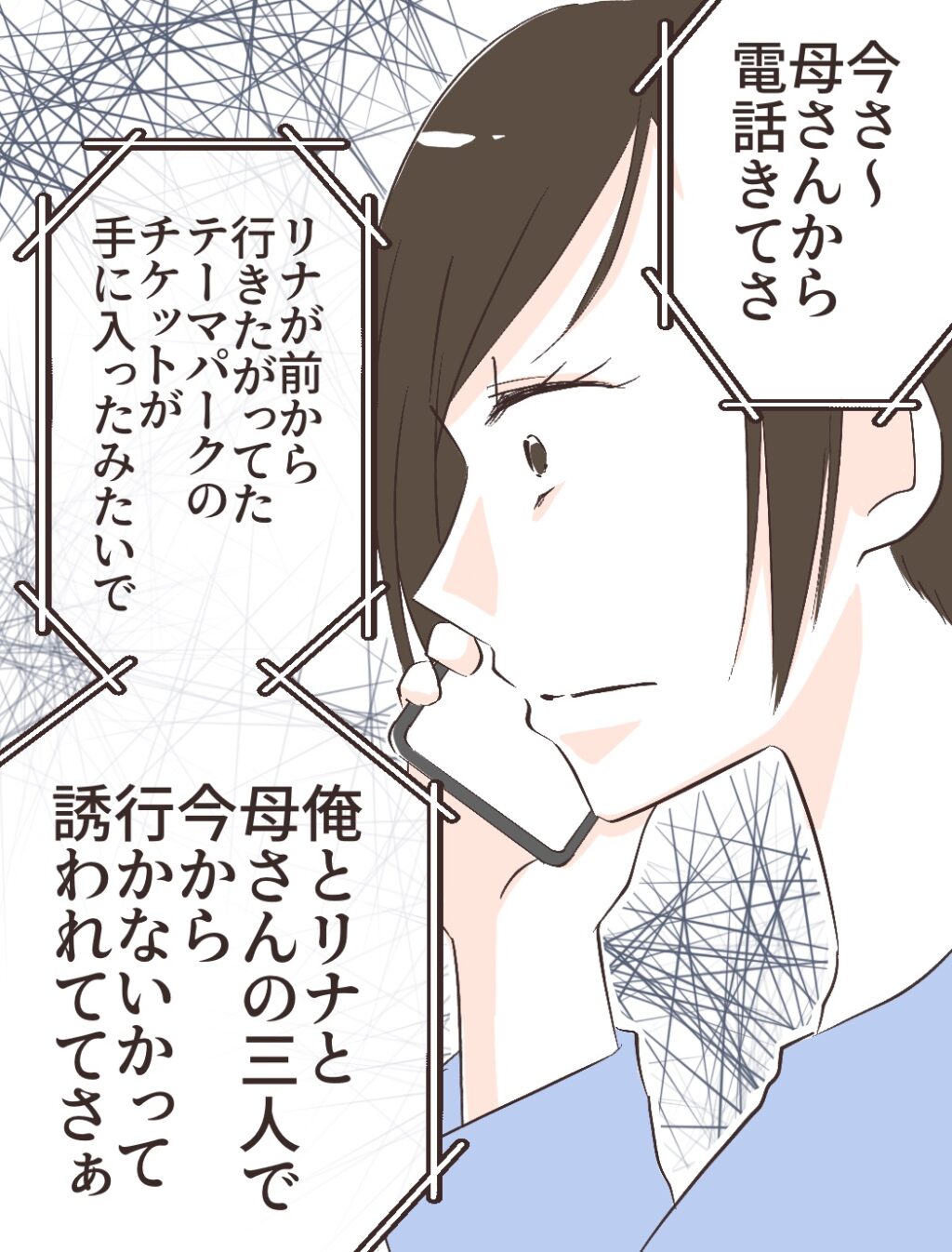 タイキいわく、リナが前から行きたがっていたテーマパークのチケットが偶然手に入ったらしく、「今から3人で行かない?」と義母から誘いがきたとのこと。思いもよらない話に、私は言葉を失ってしまいました。