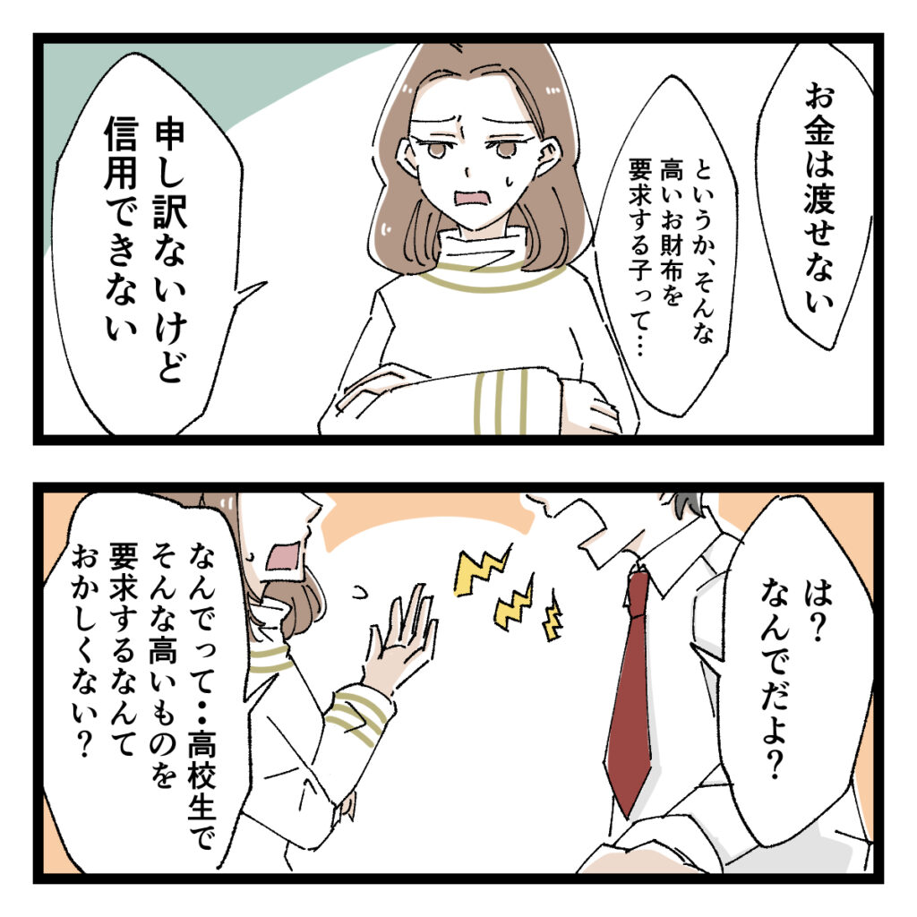 好きな子に喜んで欲しいというショウの気持ちは分からなくもないですが、高校生が8万円のプレゼントを渡すなんてやはり普通ではありません。「お金は渡せない。というか、そんな高いお財布を要求する子って・・申し訳ないけど信用できない」私がそう言うと、ショウは「は?なんでだよ」と反発。「なんでって・・高校生でそんな高いものを要求するなんておかしくない?」冷静さを失っているように見えるショウに私は必死に説明しました。