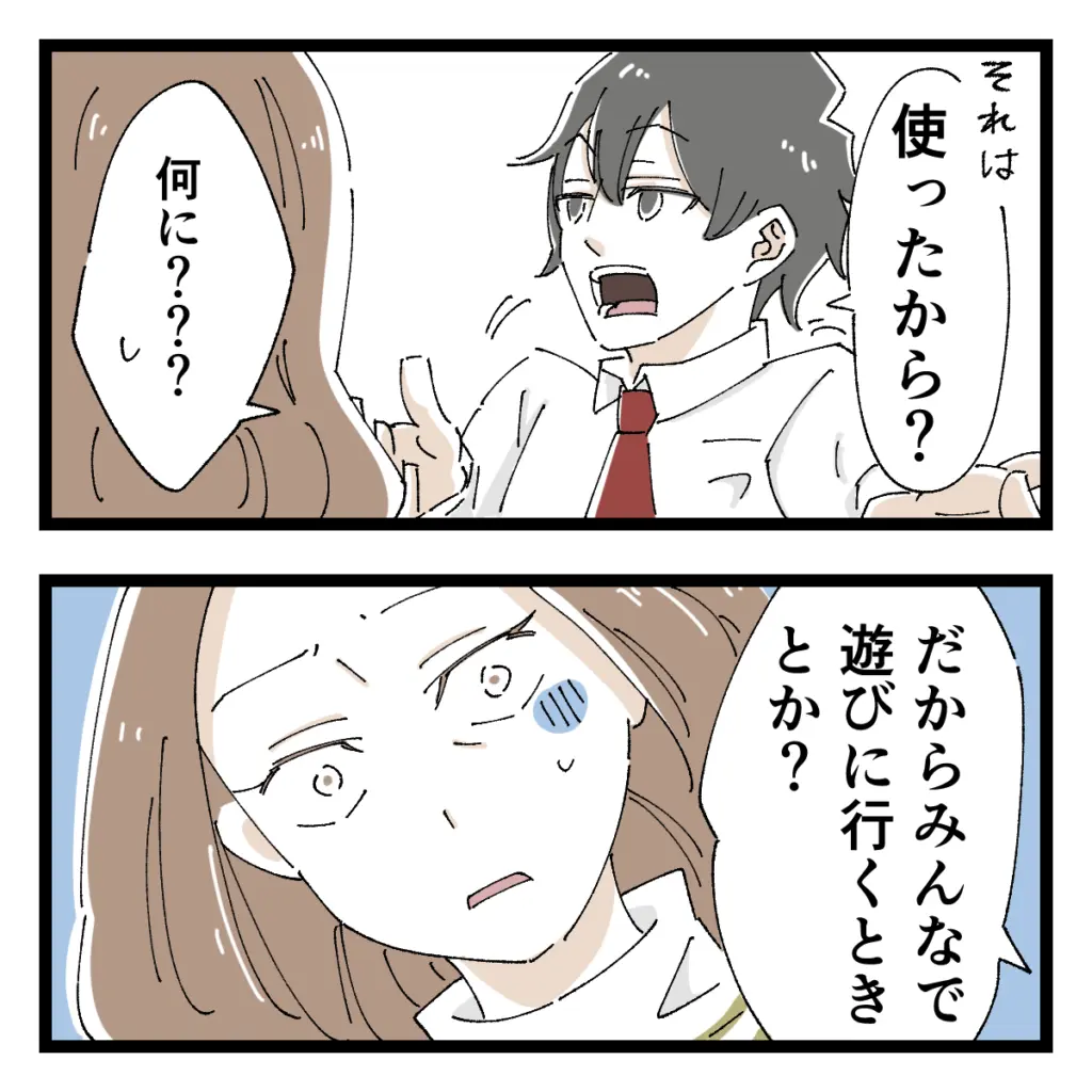 ショウは「それは、使ったから?」とさらり。嫌な予感・・。「何に???」と聞くと「だから、みんなで遊びに行くときとか?」と言うので、