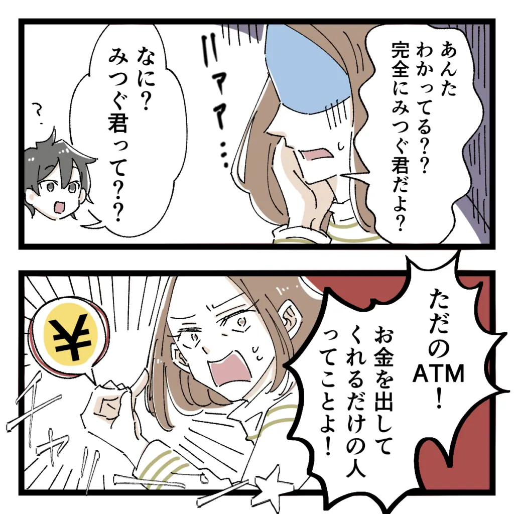 深いため息とともに「あんたわかってる??完全にみつぐ君だよ?」と言うと、ショウは「なに?みつぐ君って??」ときょとん。私は心を鬼にして「ただのATM!お金を出してくれるだけの人ってことよ!」と悲しい現実をショウに告げました。