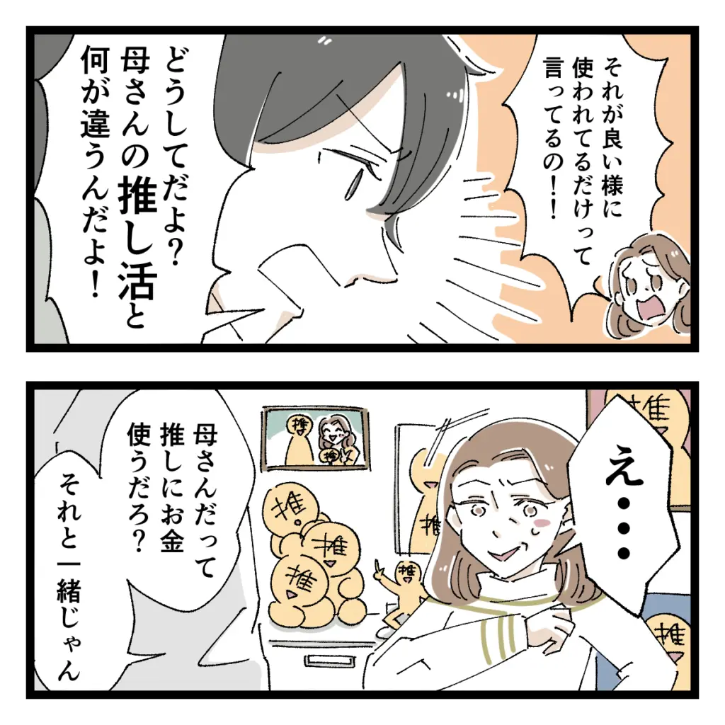 「それが良い様に使われてるだけって言ってるの!!」と言うと、「どうしてだよ?母さんの推し活と何か違うんだよ!」ショウにそう言われ、「え・・」と言葉に詰まると、「母さんだって推しにお金使うだろ?それと一緒じゃん」と、私が推しまくっているアイドルグループのことをショウが指摘してきたのです!