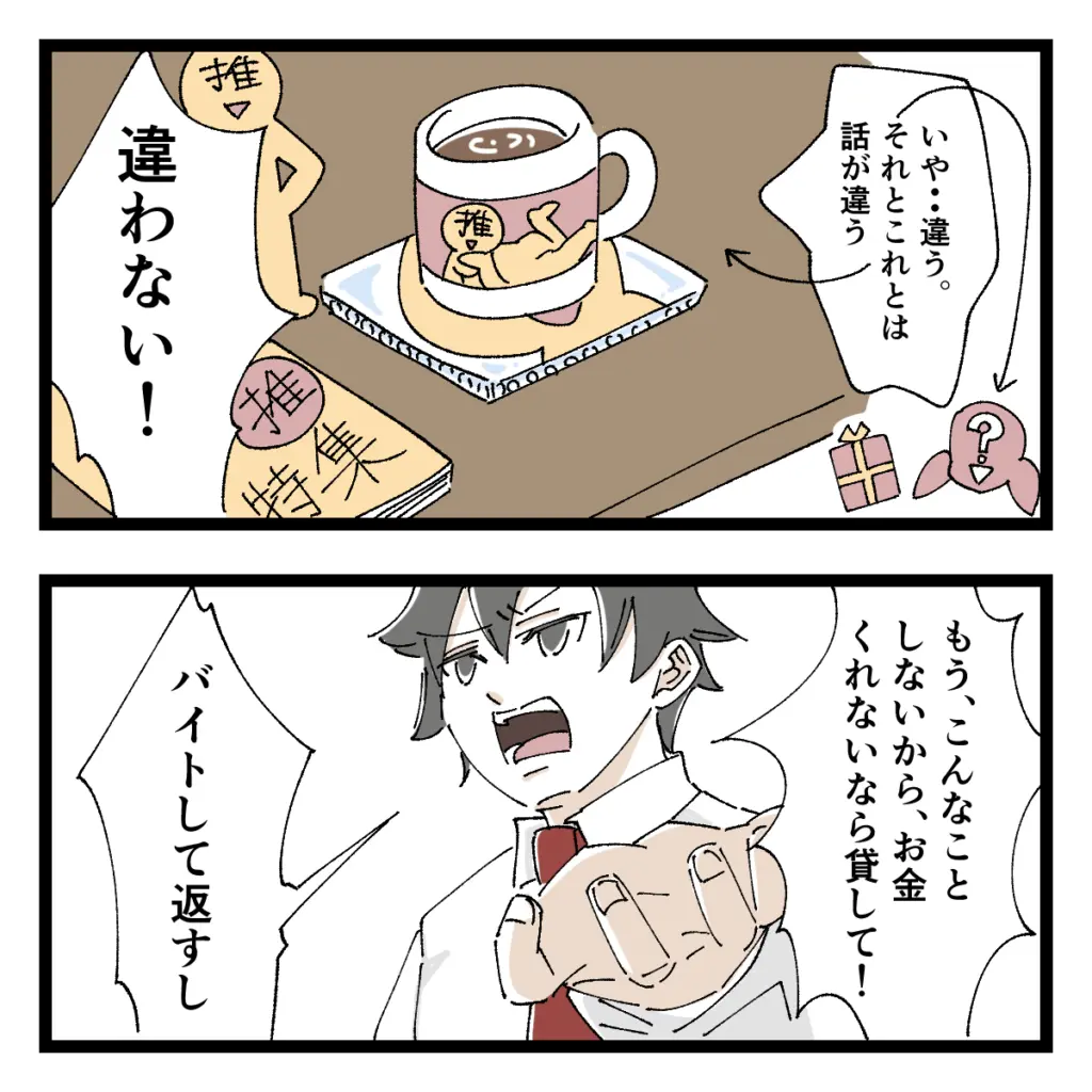 そして「いや・・違う。それとこれとは話が違う」と私がいい訳しようとすると、「違わない!」と即答。推しのマグカップに推しの写真集、推しに囲まれた生活をしている私にショウが痛いことを言う・・。そして、「もう、こんなことしないから、お金くれないなら貸して!バイトして返すし」と絶対にプレゼントを買う!という意志がみなぎるショウにそう言われ、