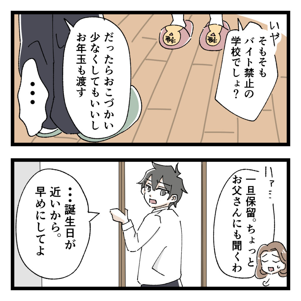 「いや、そもそもバイト禁止の学校でしょ?」推しのスリッパを履いた私がそう言うと、「だったらおこづかい少なくしてもいいし、お年玉も渡す」とショウに言われ言葉を失う私。「ハァ・・一旦保留。ちょっとお父さんにも聞くわ」私がそう言うと、「・・誕生日が近いから。早めにしてよ」そう言って部屋に入ってしまいました。