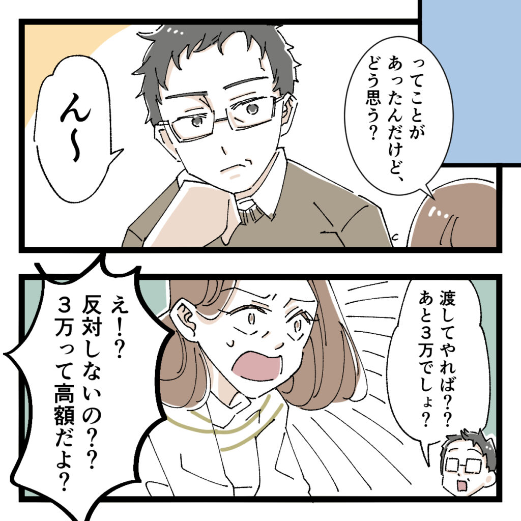 そして、「・・ってことがあったんだけど、どう思う?」早速夫に相談すると、「ん~」と考え込んだ後、「渡してやれば?あと3万でしょ?」サラッとそう言われ、「え!?反対しないの??3万って高額だよ?」と驚いて反論したのでした。